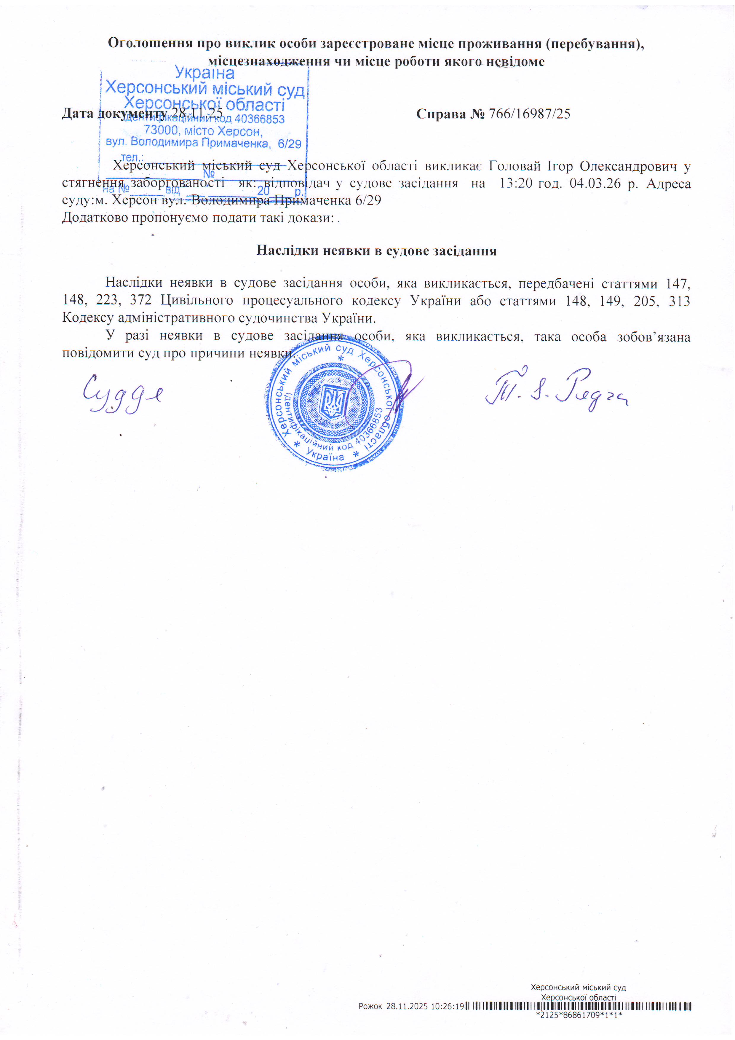 ОГОЛОШЕННЯ ПРО ВИКЛИК ДО СУДУ