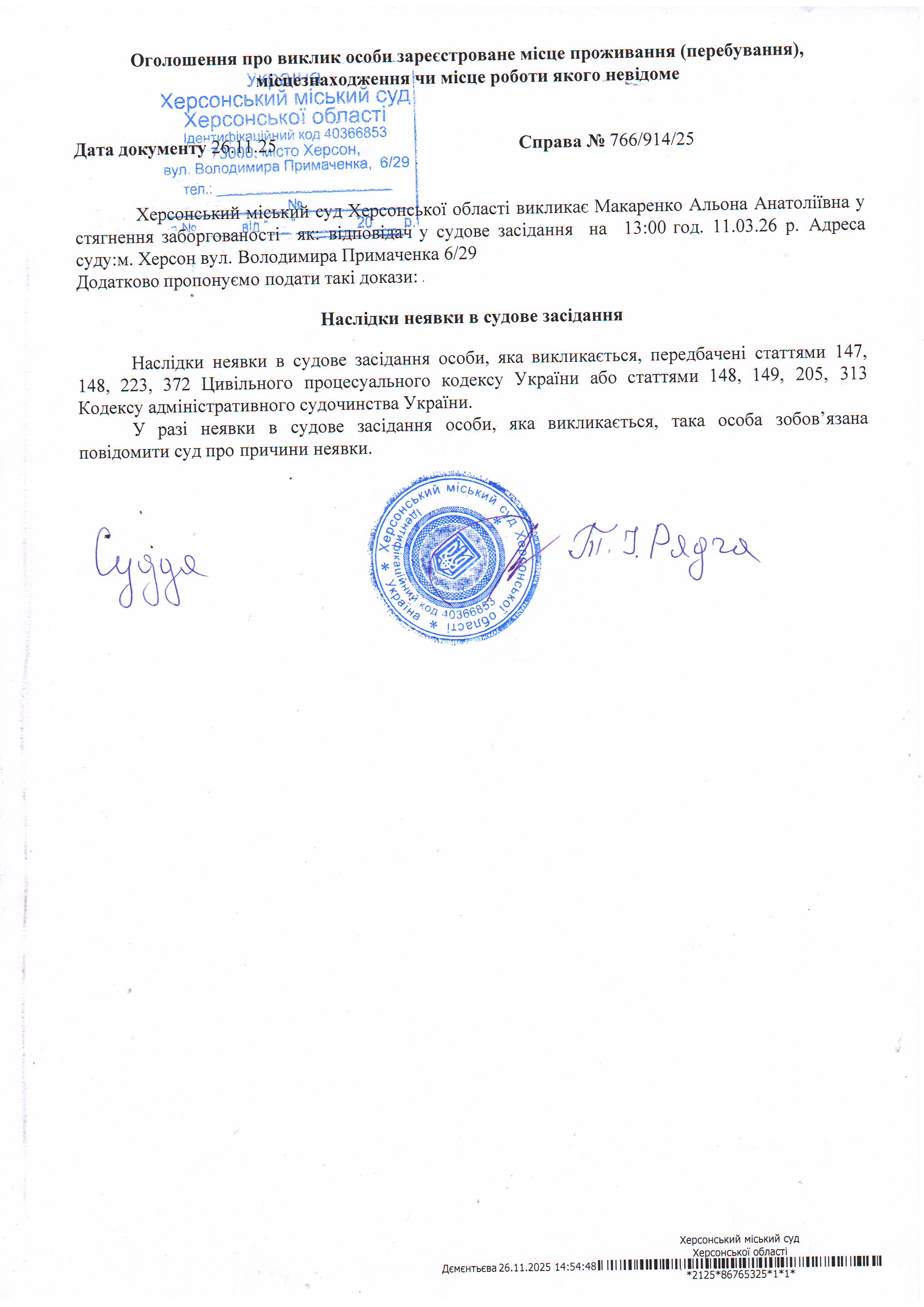 ОГОЛОШЕННЯ ПРО ВИКЛИК ДО СУДУ