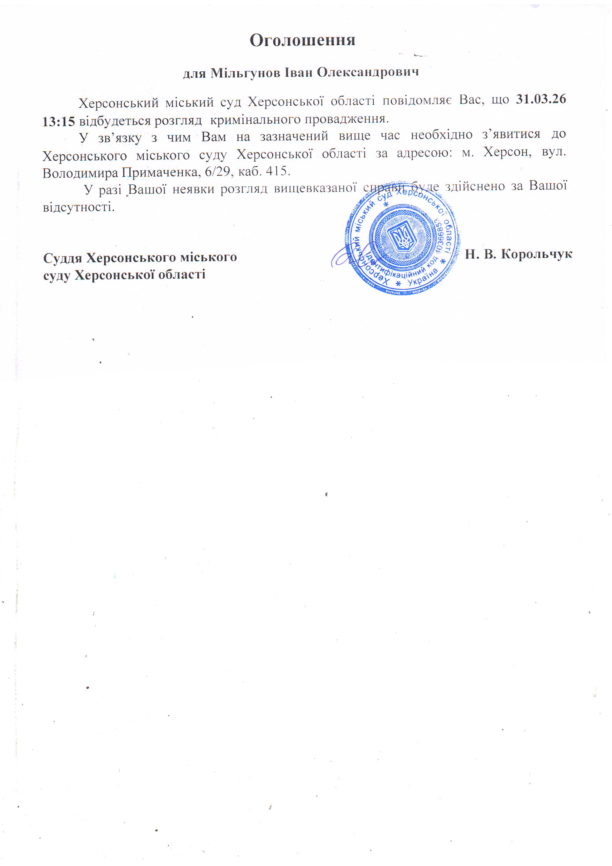 ОГОЛОШЕННЯ ПРО ВИКЛИК ДО СУДУ