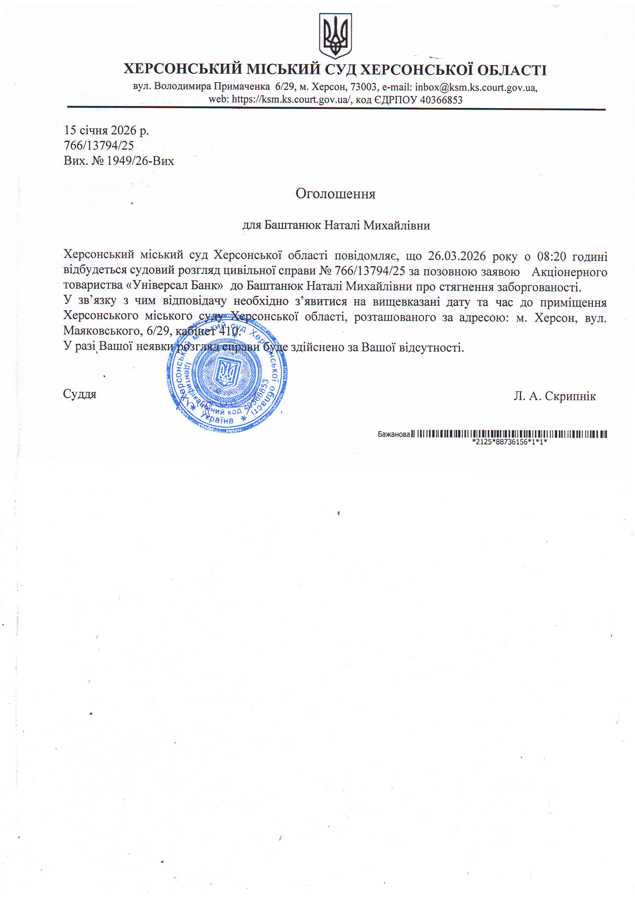 ОГОЛОШЕННЯ ПРО ВИКЛИК ДО СУДУ