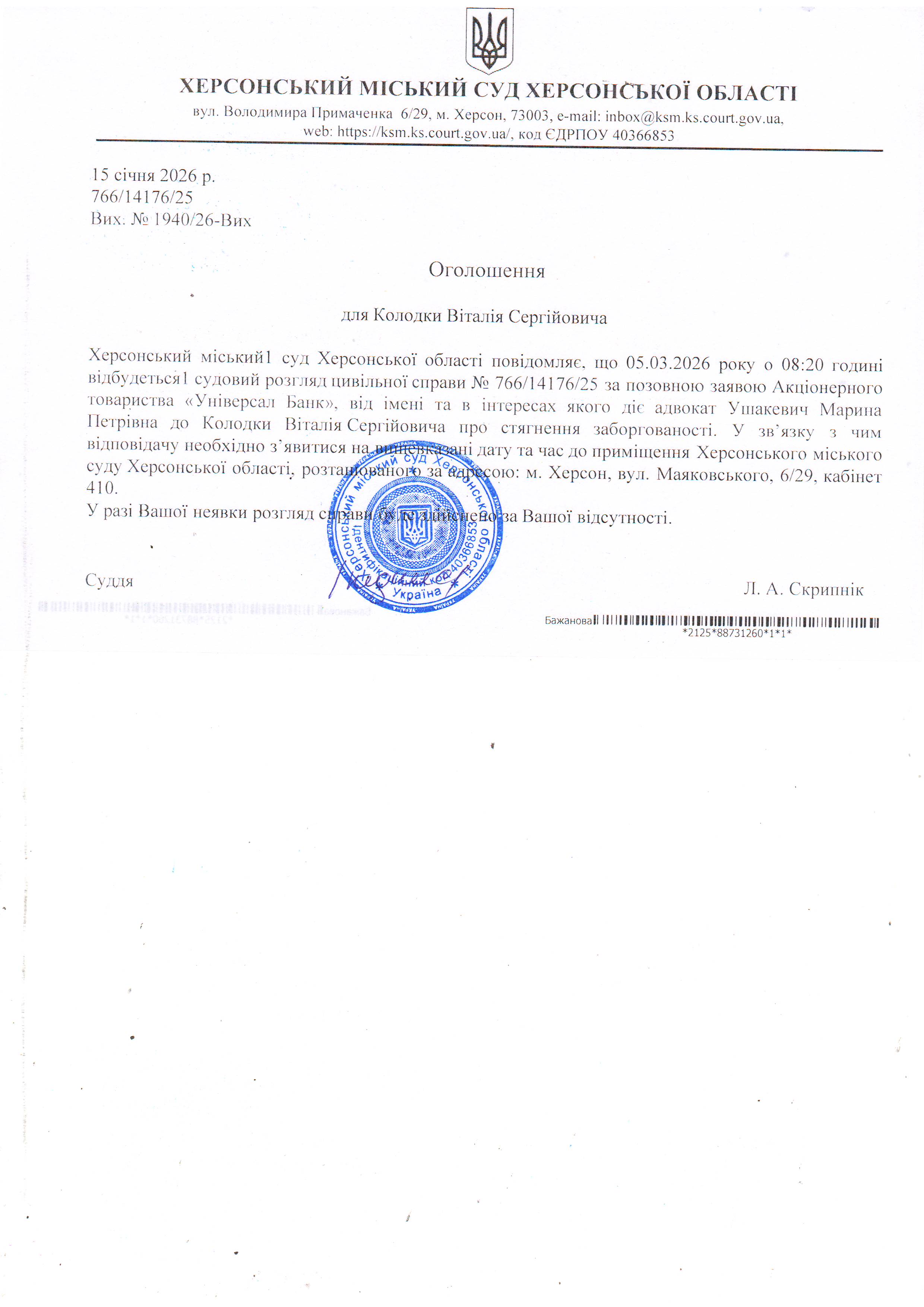 ОГОЛОШЕННЯ ПРО ВИКЛИК ДО СУДУ