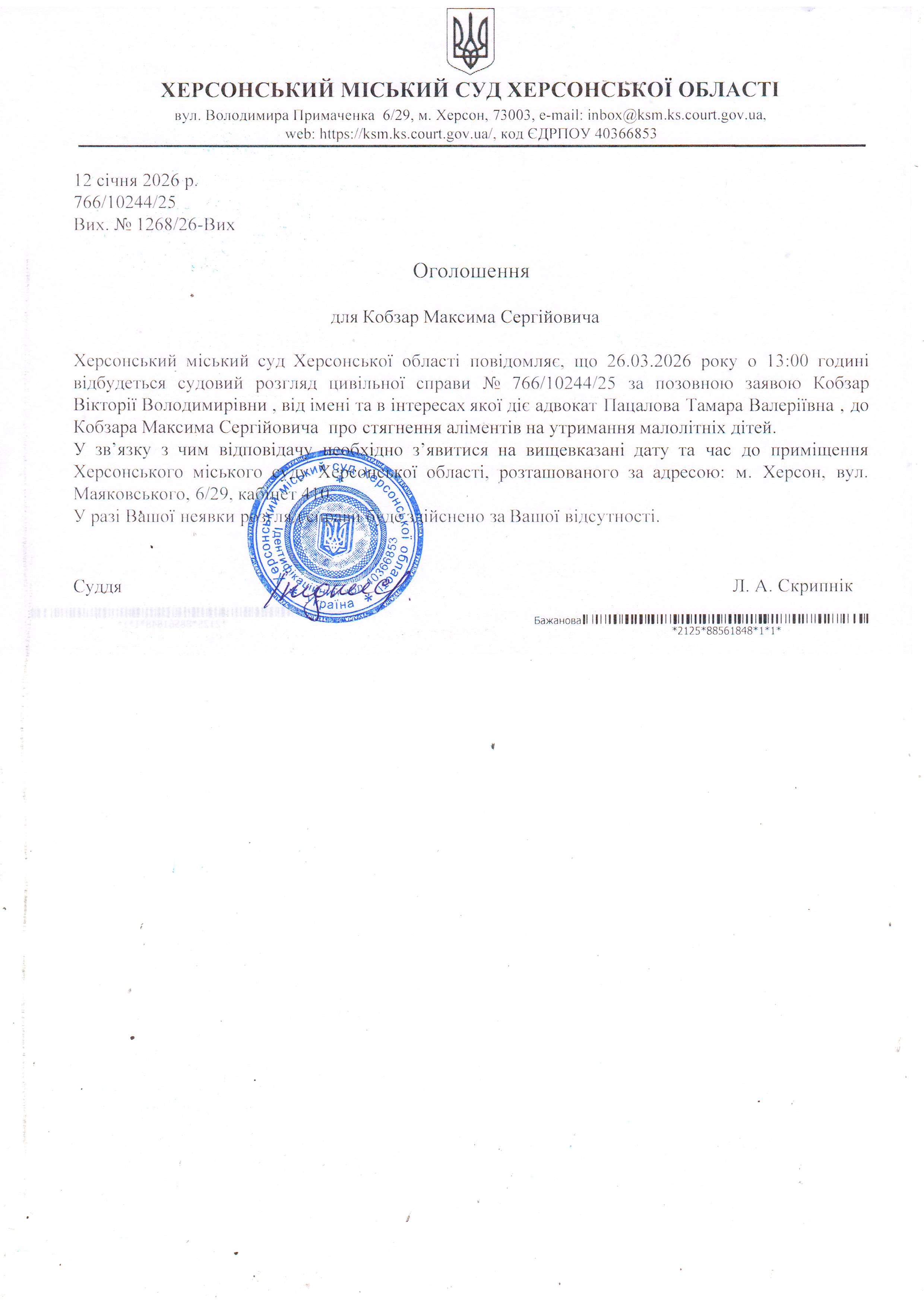 Оголошення для Кобзара Максима Сергійовича