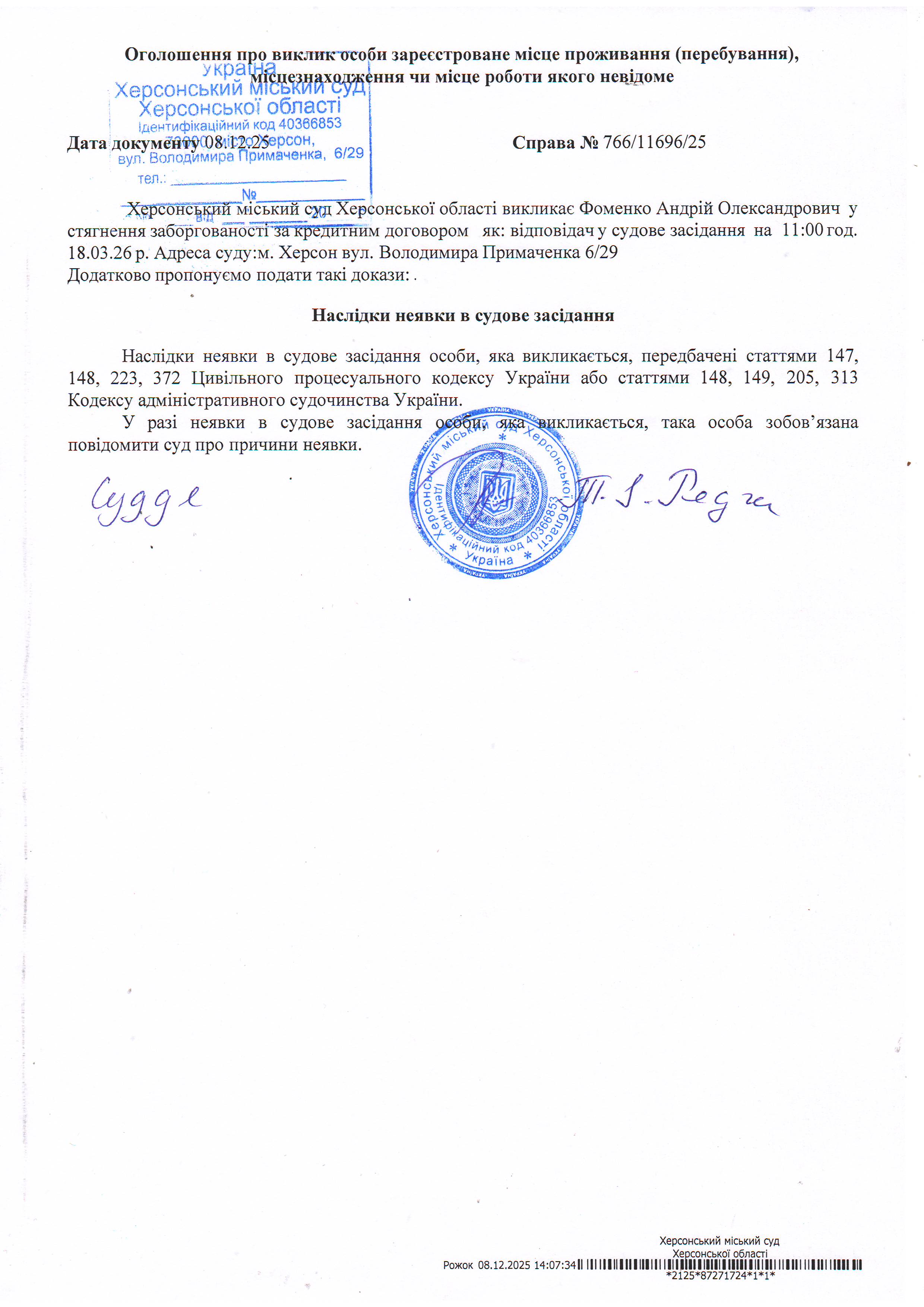 ОГОЛОШЕННЯ ПРО ВИКЛИК ДО СУДУ