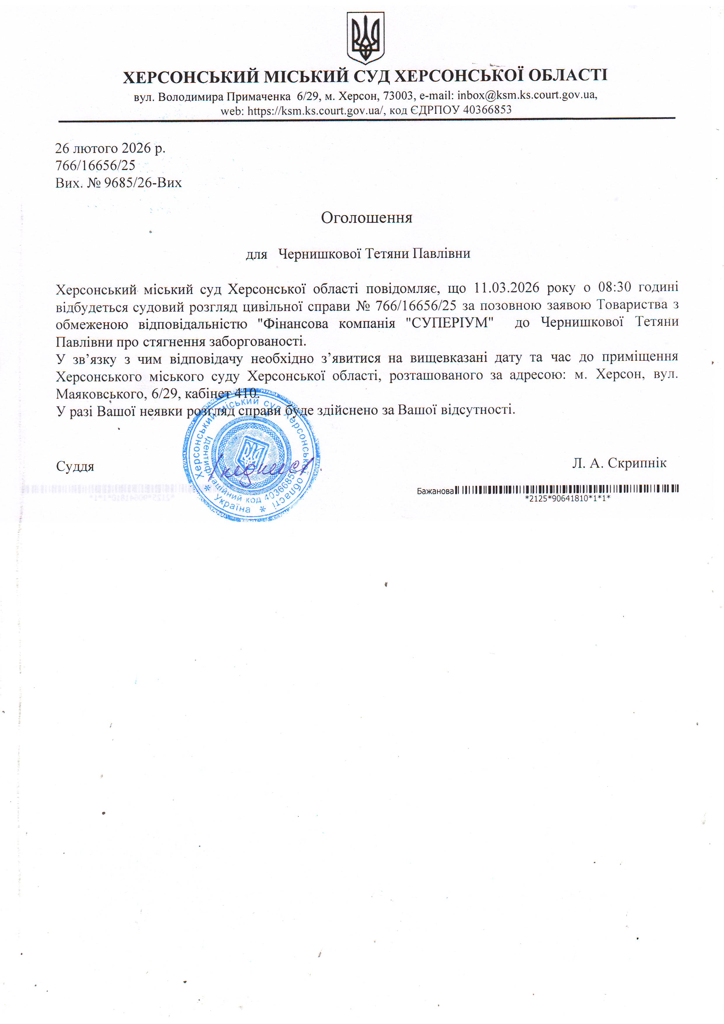 Оголошення про виклик особи в суд та повідомлення про судове рішення