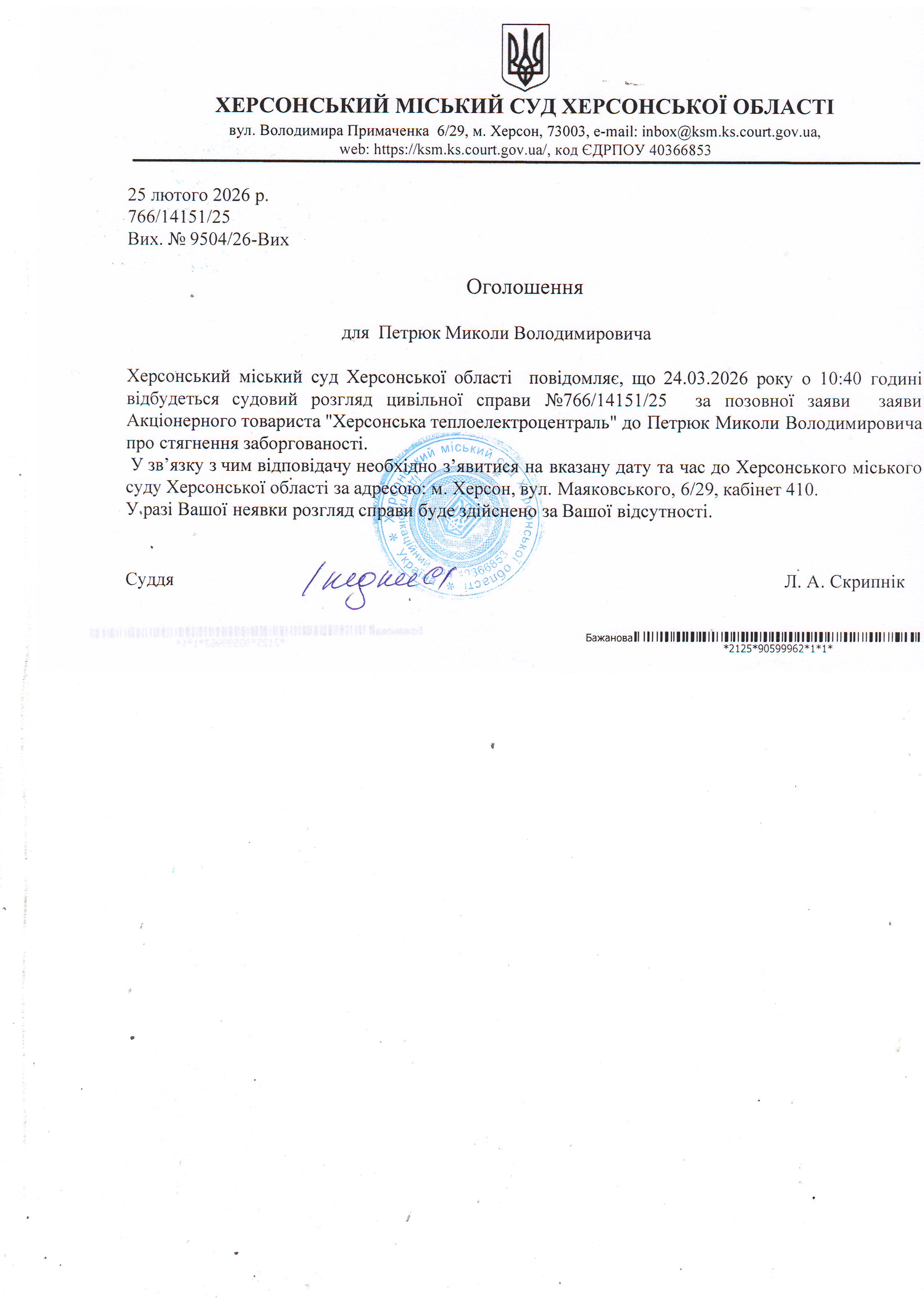 ОГОЛОШЕННЯ ПРО ВИКЛИК ДО СУДУ