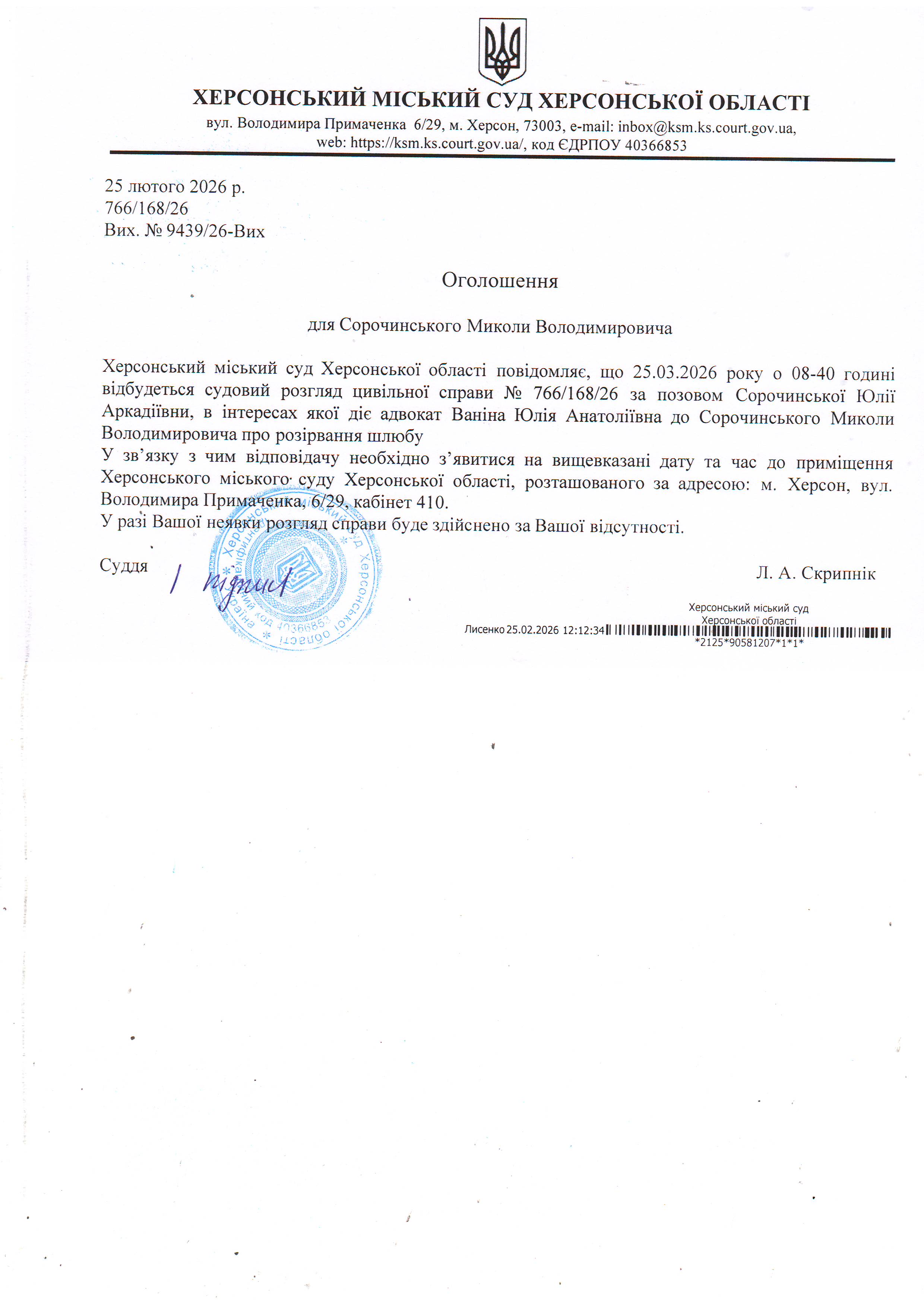 ОГОЛОШЕННЯ ПРО ВИКЛИК ДО СУДУ