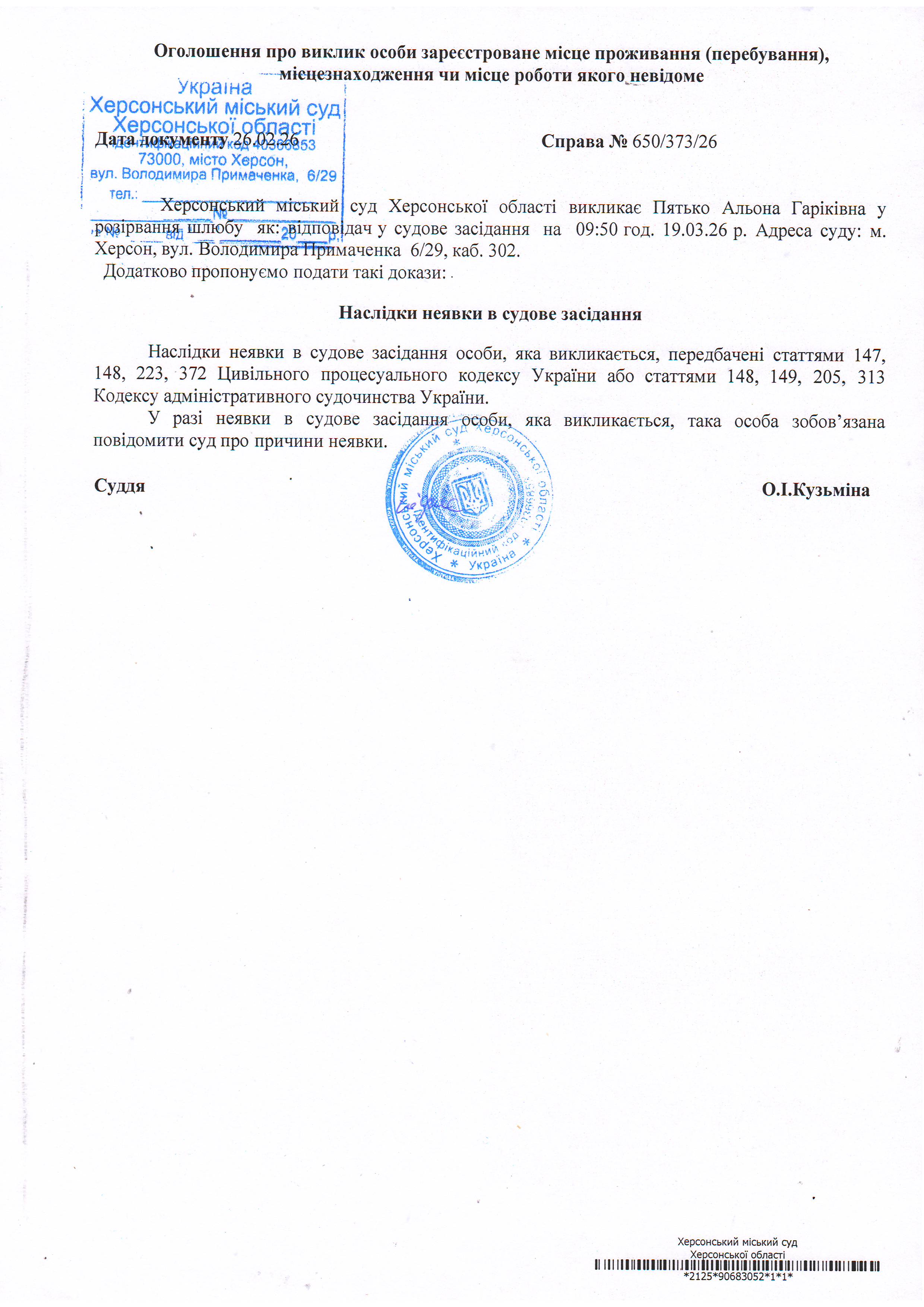 ОГОЛОШЕННЯ ПРО ВИКЛИК ДО СУДУ