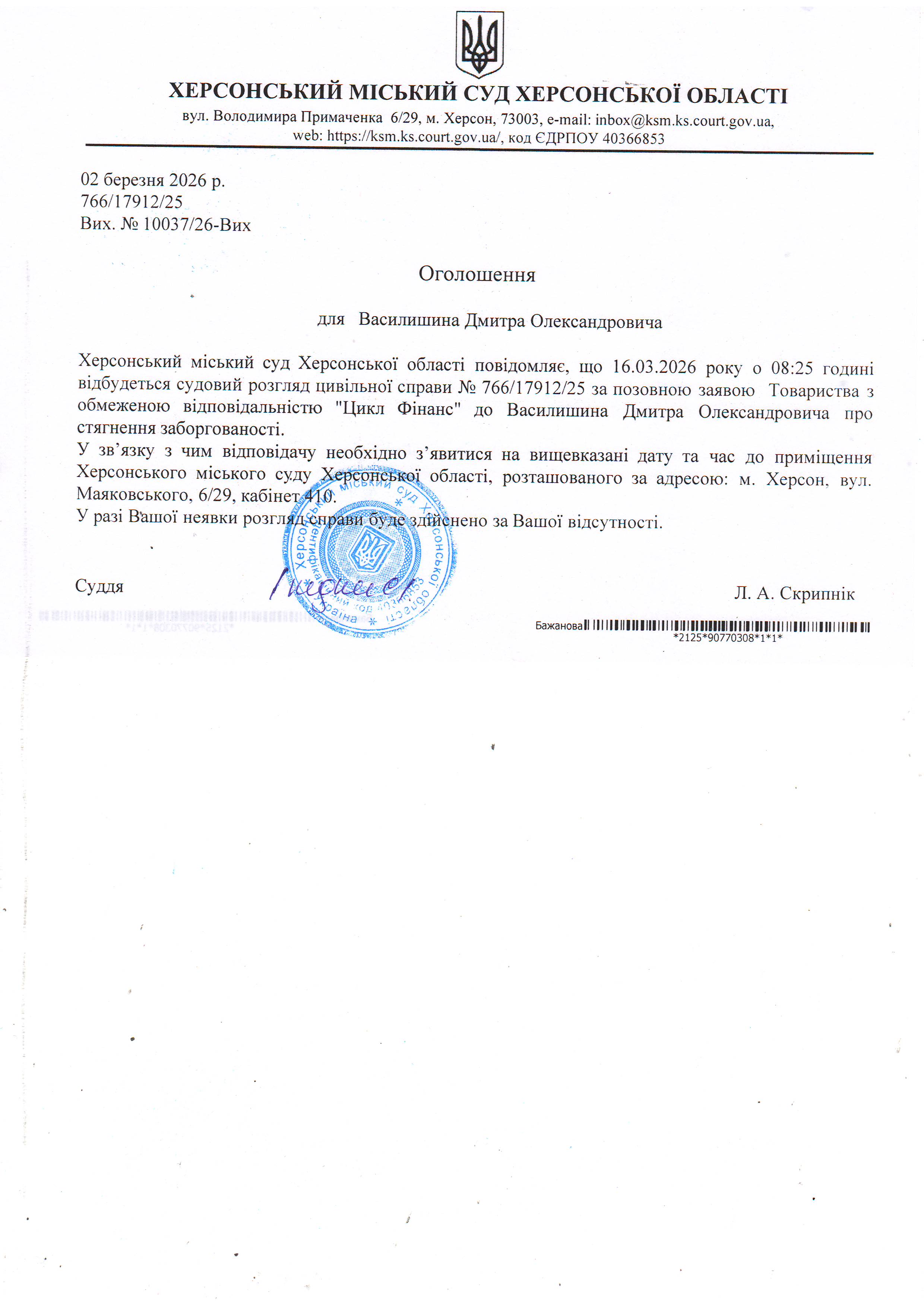 ОГОЛОШЕННЯ ПРО ВИКЛИК ДО СУДУ