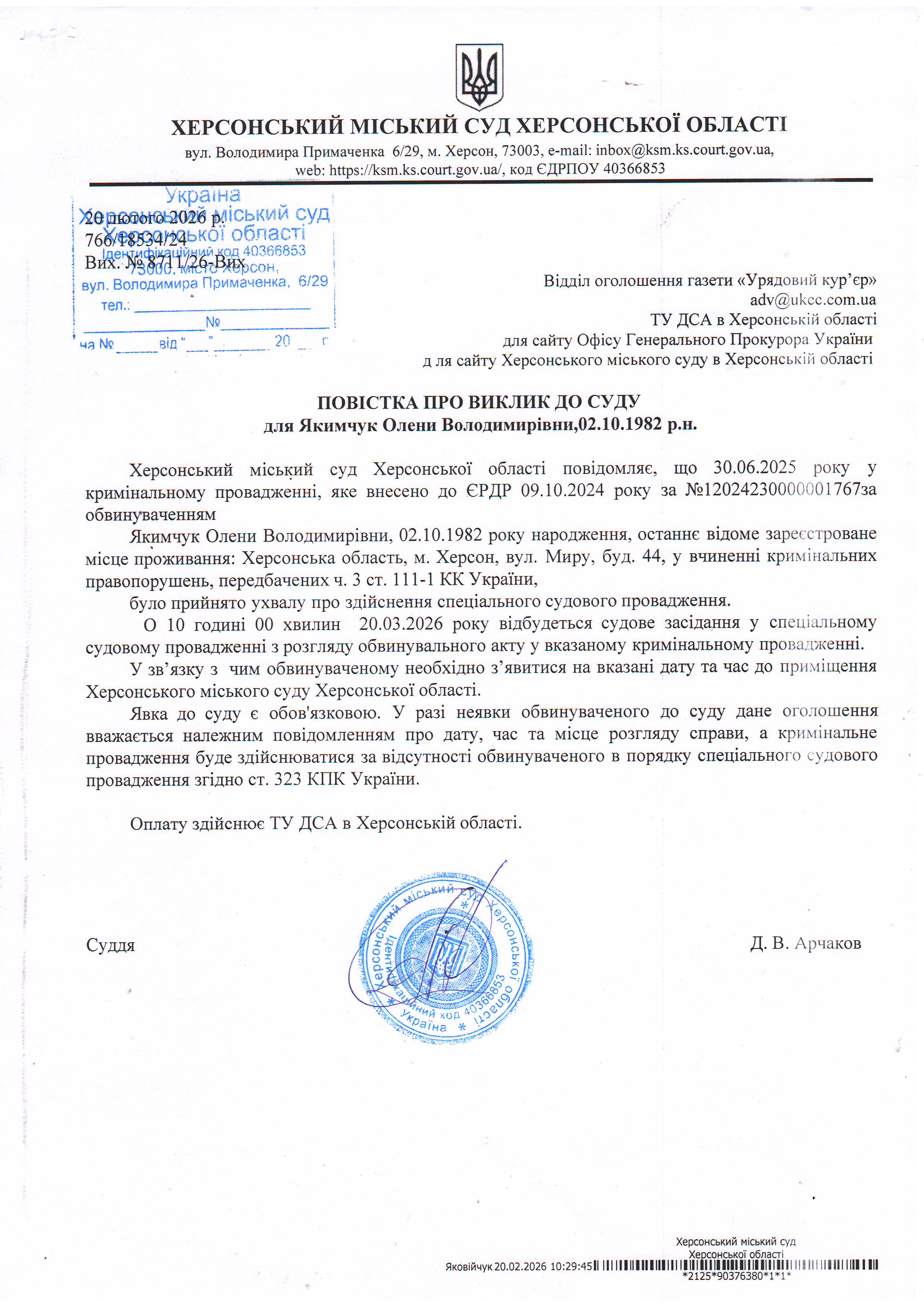 Оголошення про виклик особи в суд та повідомлення про судове рішення