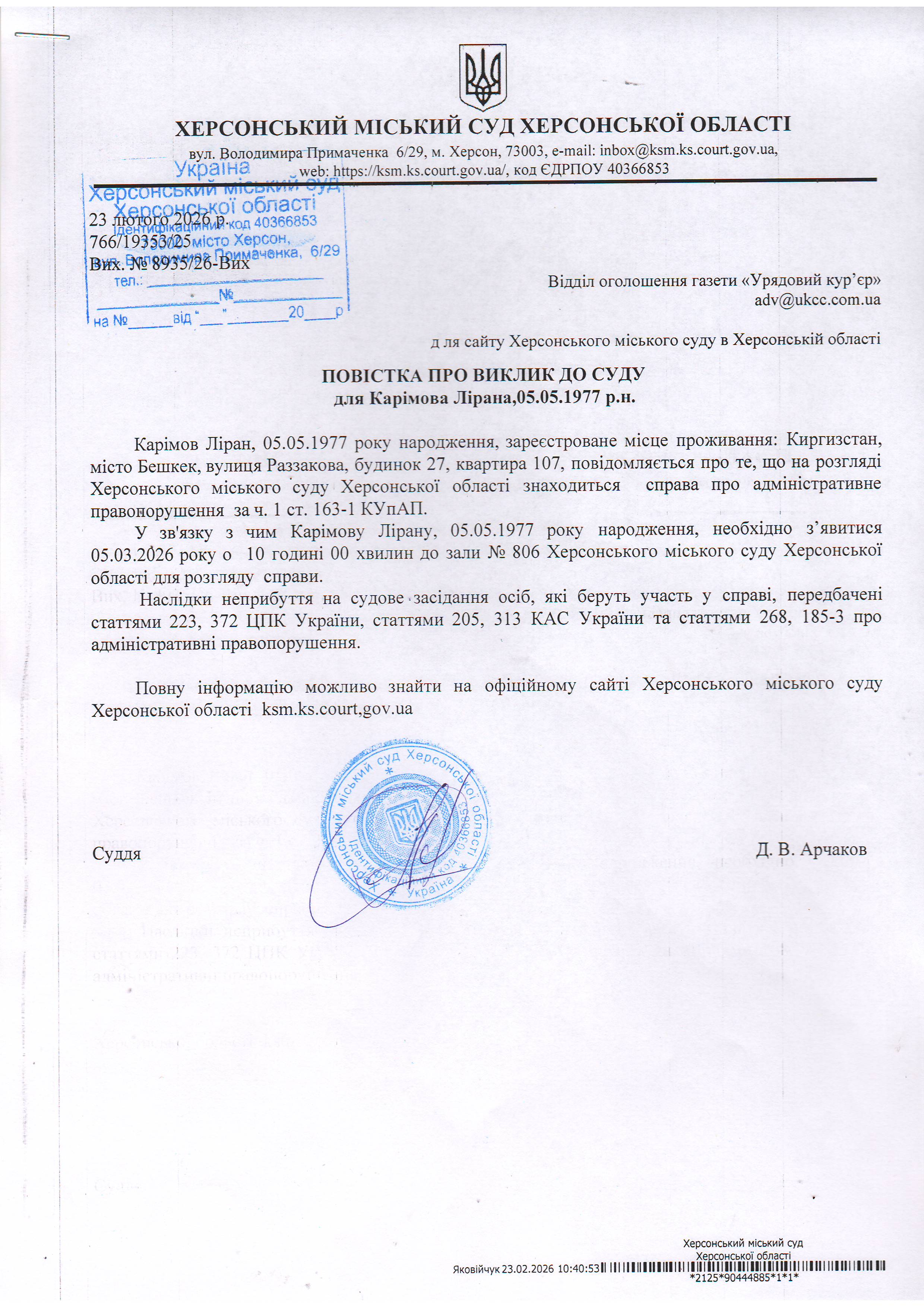 ОГОЛОШЕННЯ ПРО ВИКЛИК ДО СУДУ