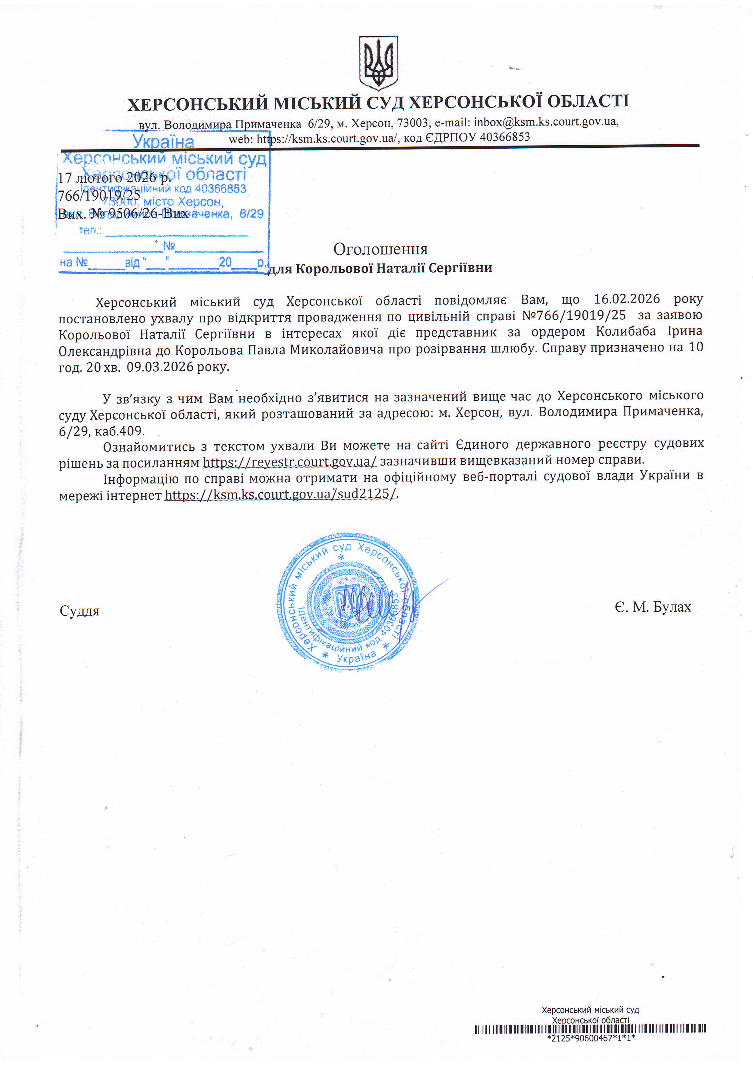 Оголошення для Корольової Наталії Сергіївни