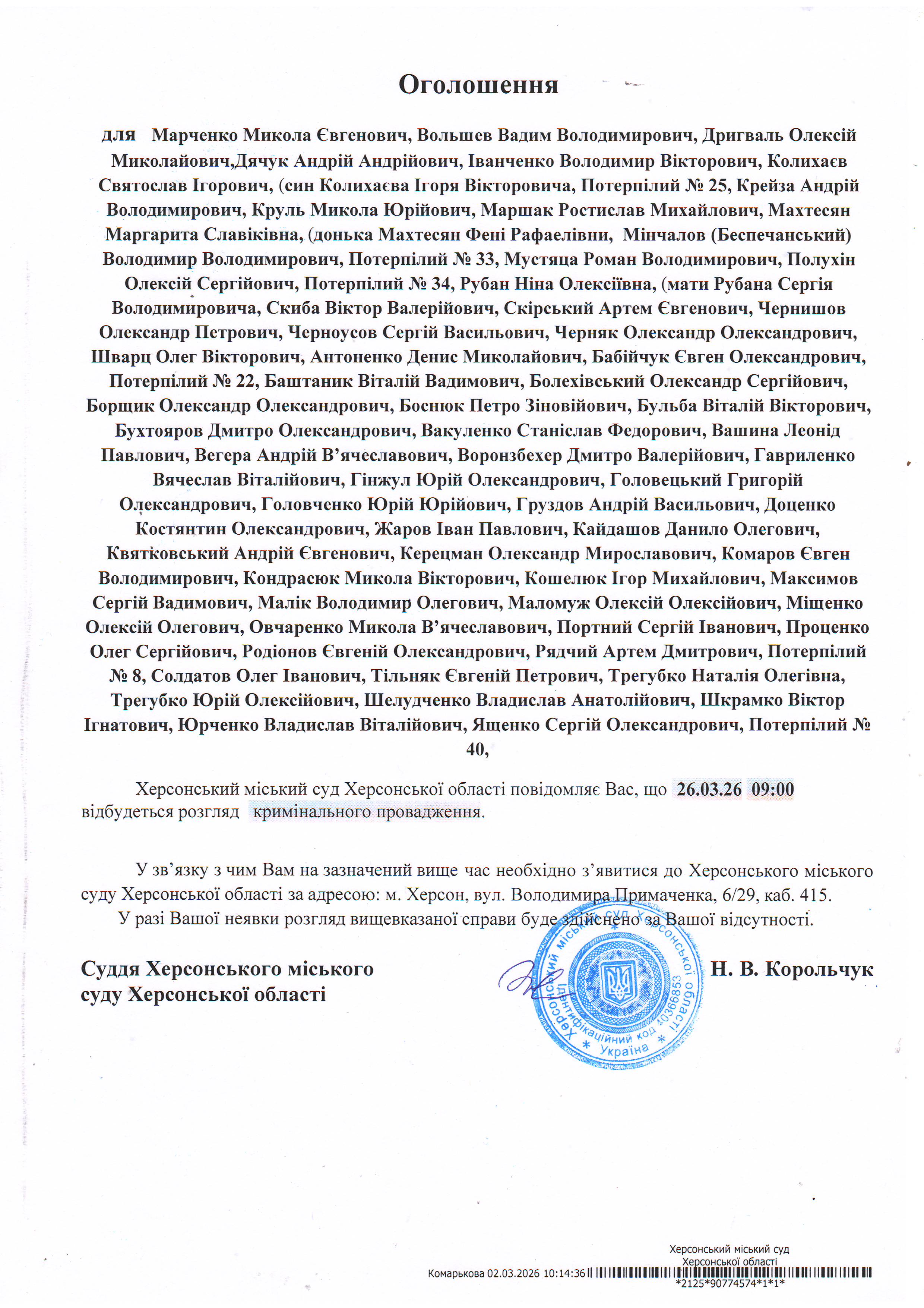 Оголошення для Марченка М.Є., Вольшева В.В., Дригваля О.М., Дячука А.А., Іванченка В.В., Колихаєва С.І. та інших