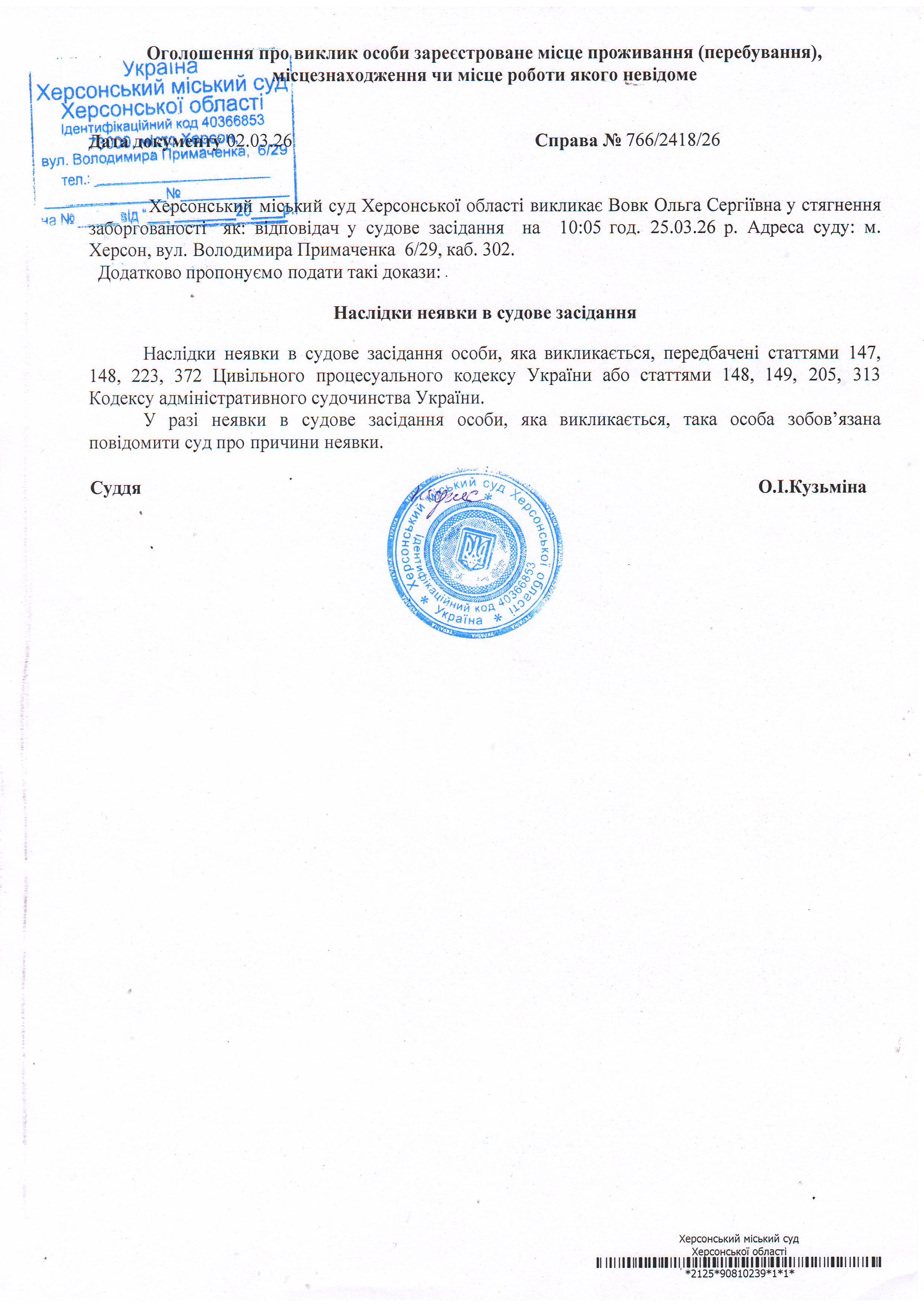 ОГОЛОШЕННЯ ПРО ВИКЛИК ДО СУДУ