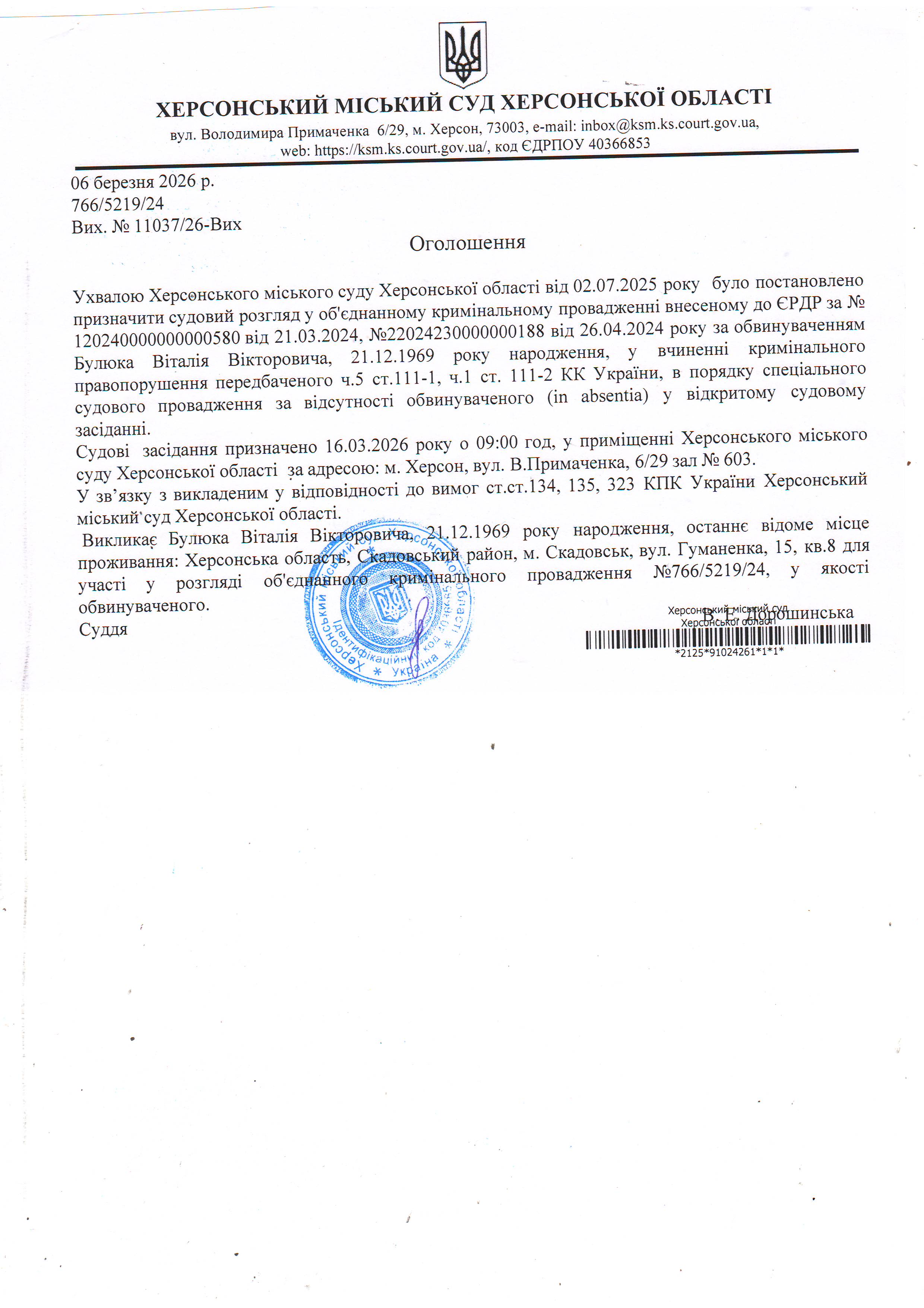 Оголошення для Булюка Віталія Вікторовича