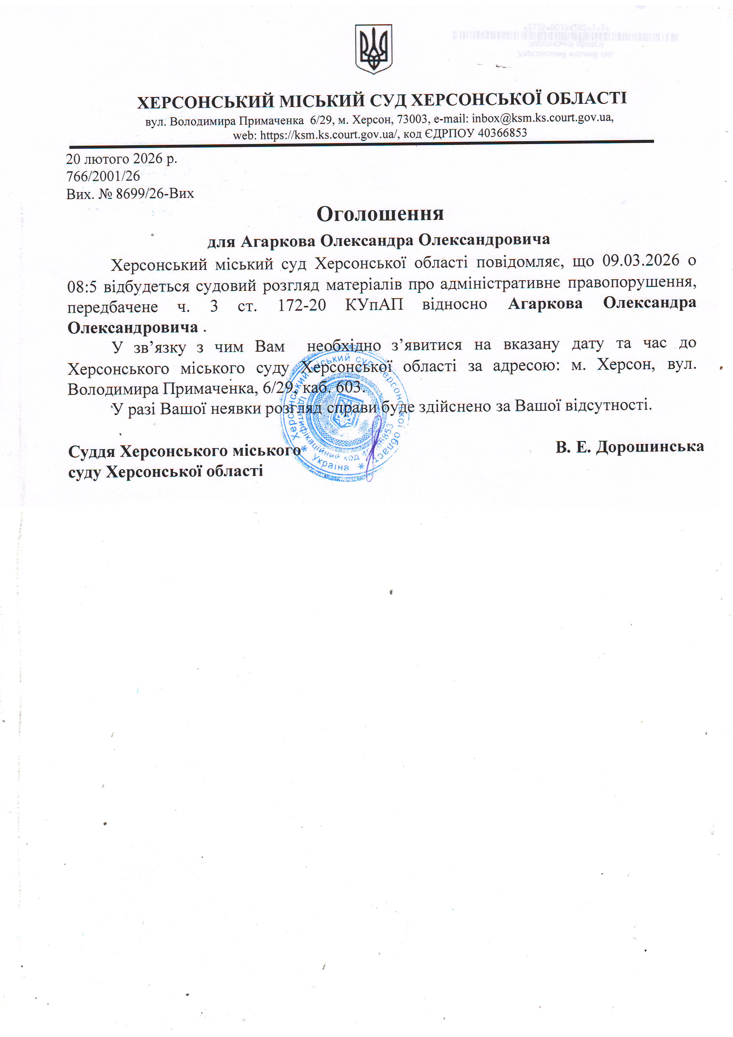 ОГОЛОШЕННЯ ПРО ВИКЛИК ДО СУДУ