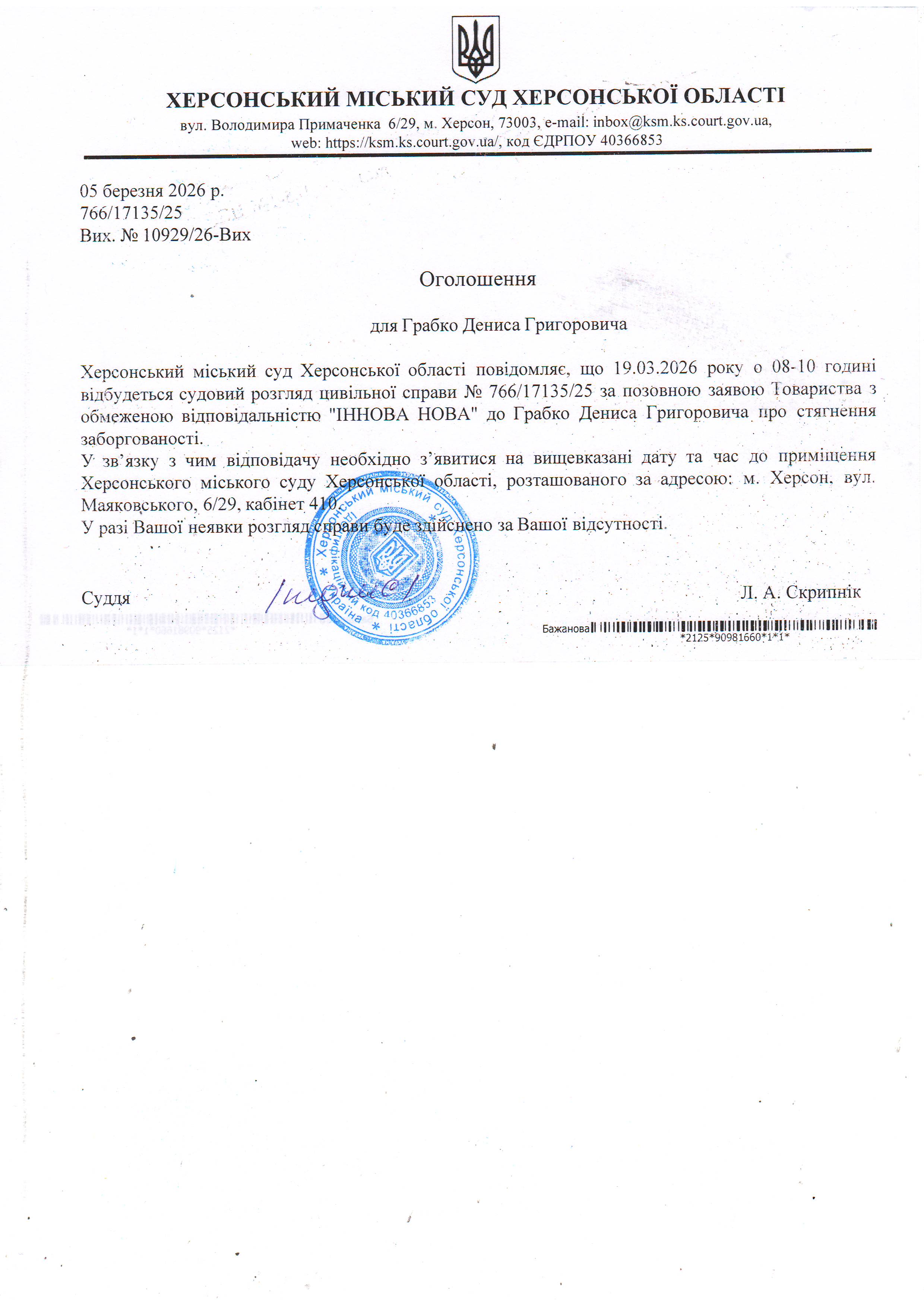 ОГОЛОШЕННЯ ПРО ВИКЛИК ДО СУДУ