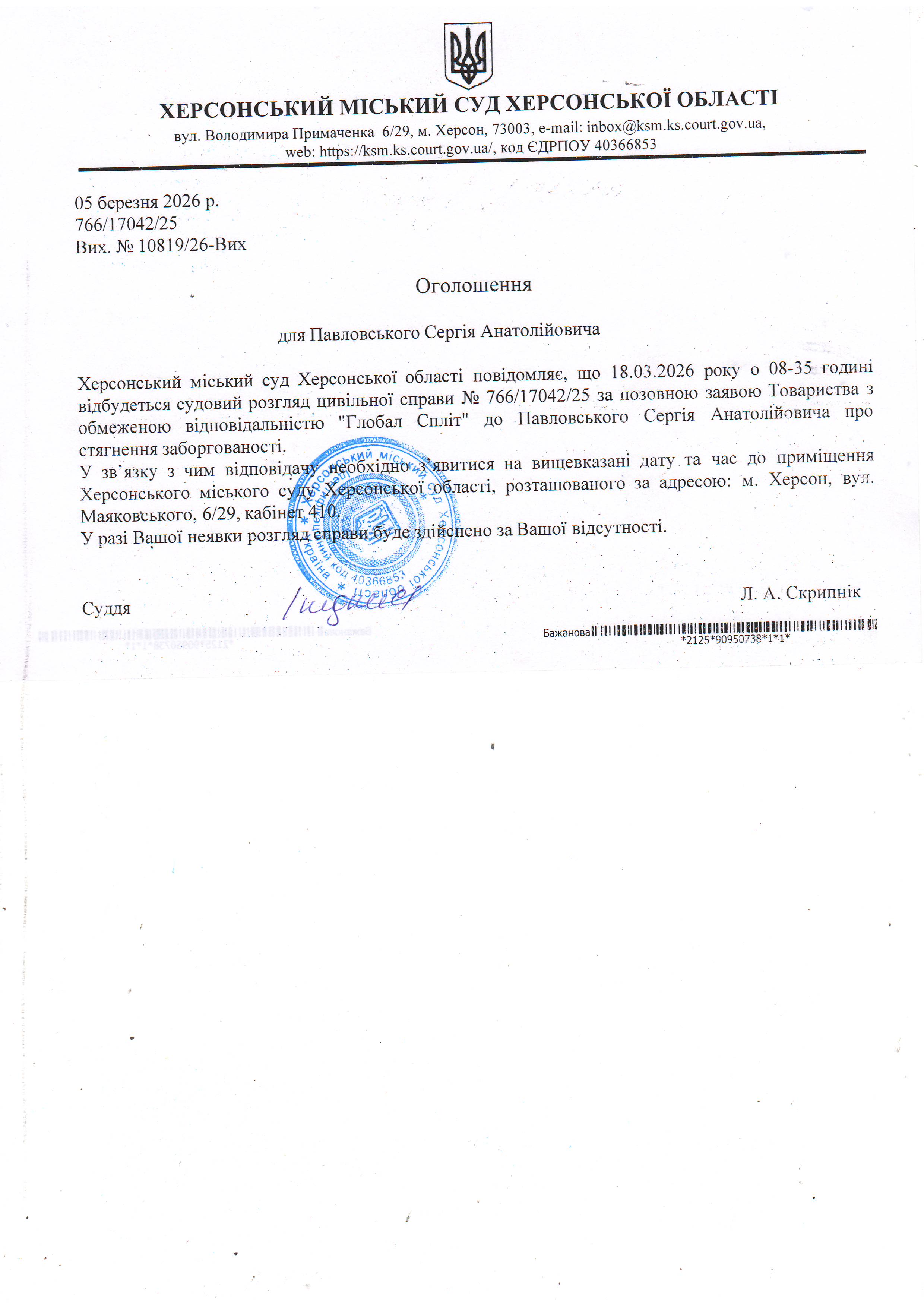 Оголошення для Павловського Сергія Анатолійовича