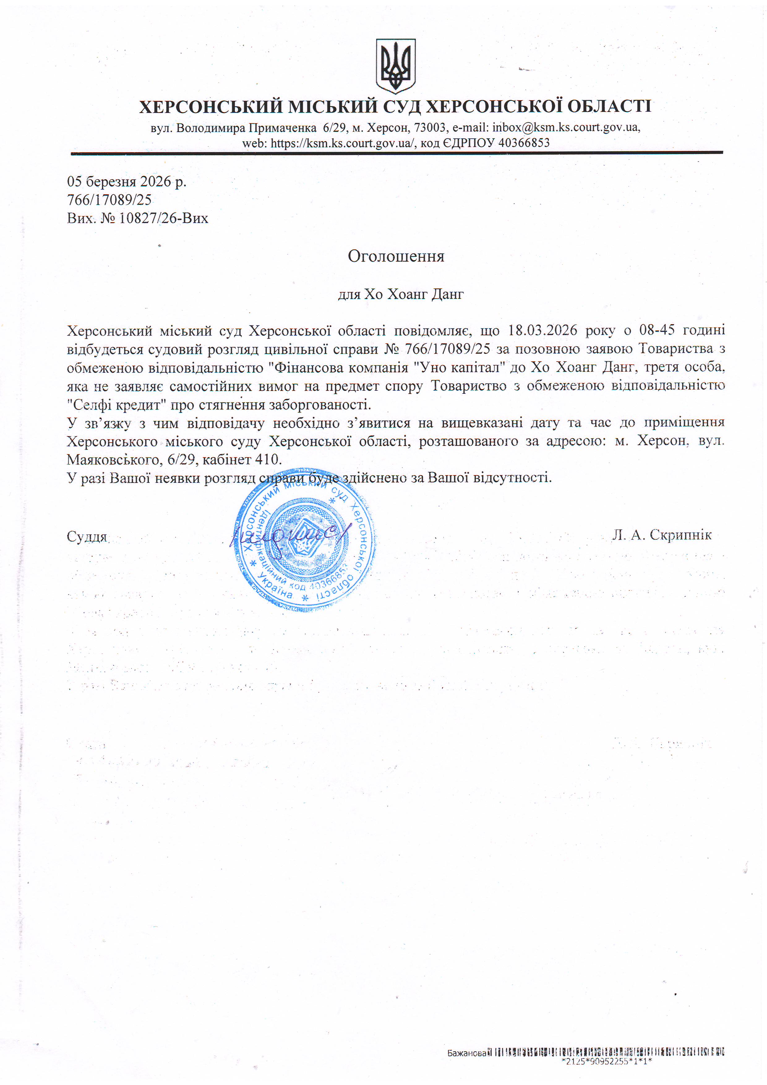 ОГОЛОШЕННЯ ПРО ВИКЛИК ДО СУДУ