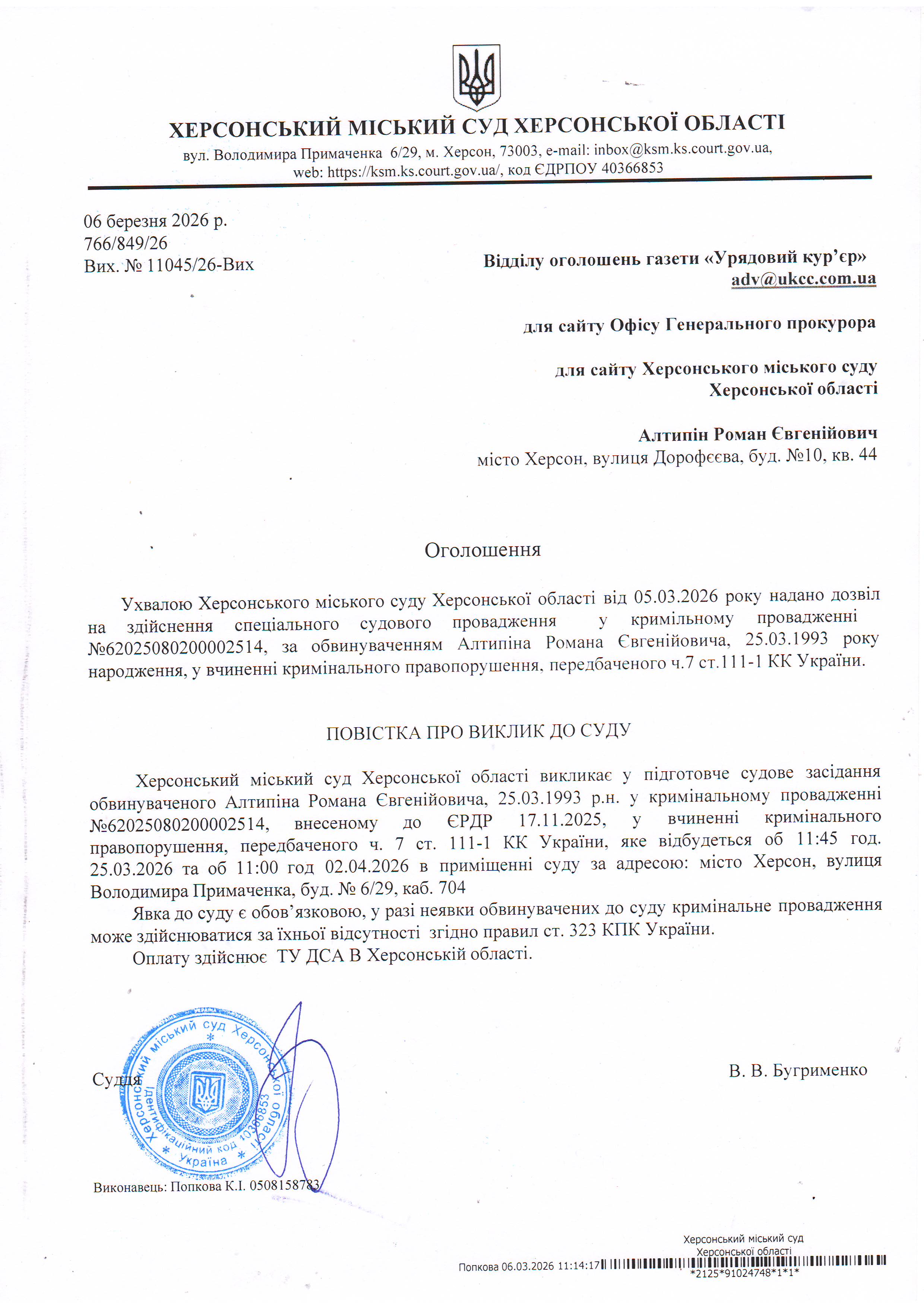 Оголошення про виклик особи в суд та повідомлення про судове рішення