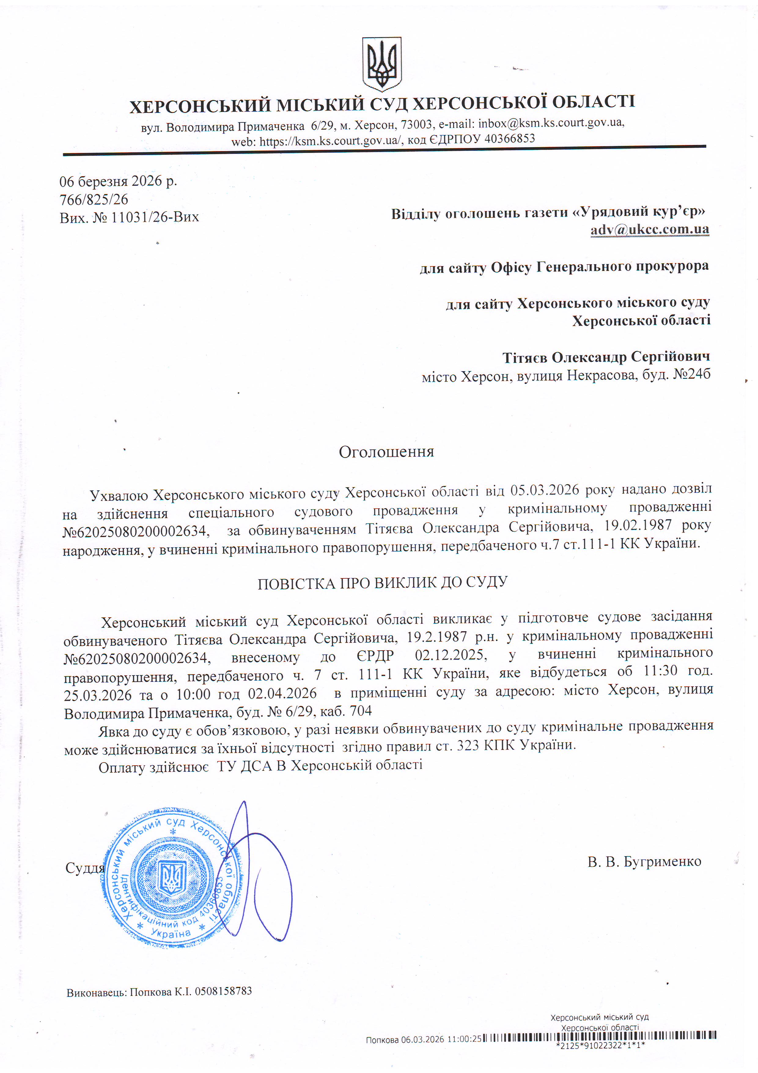 ОГОЛОШЕННЯ ПРО ВИКЛИК ДО СУДУ