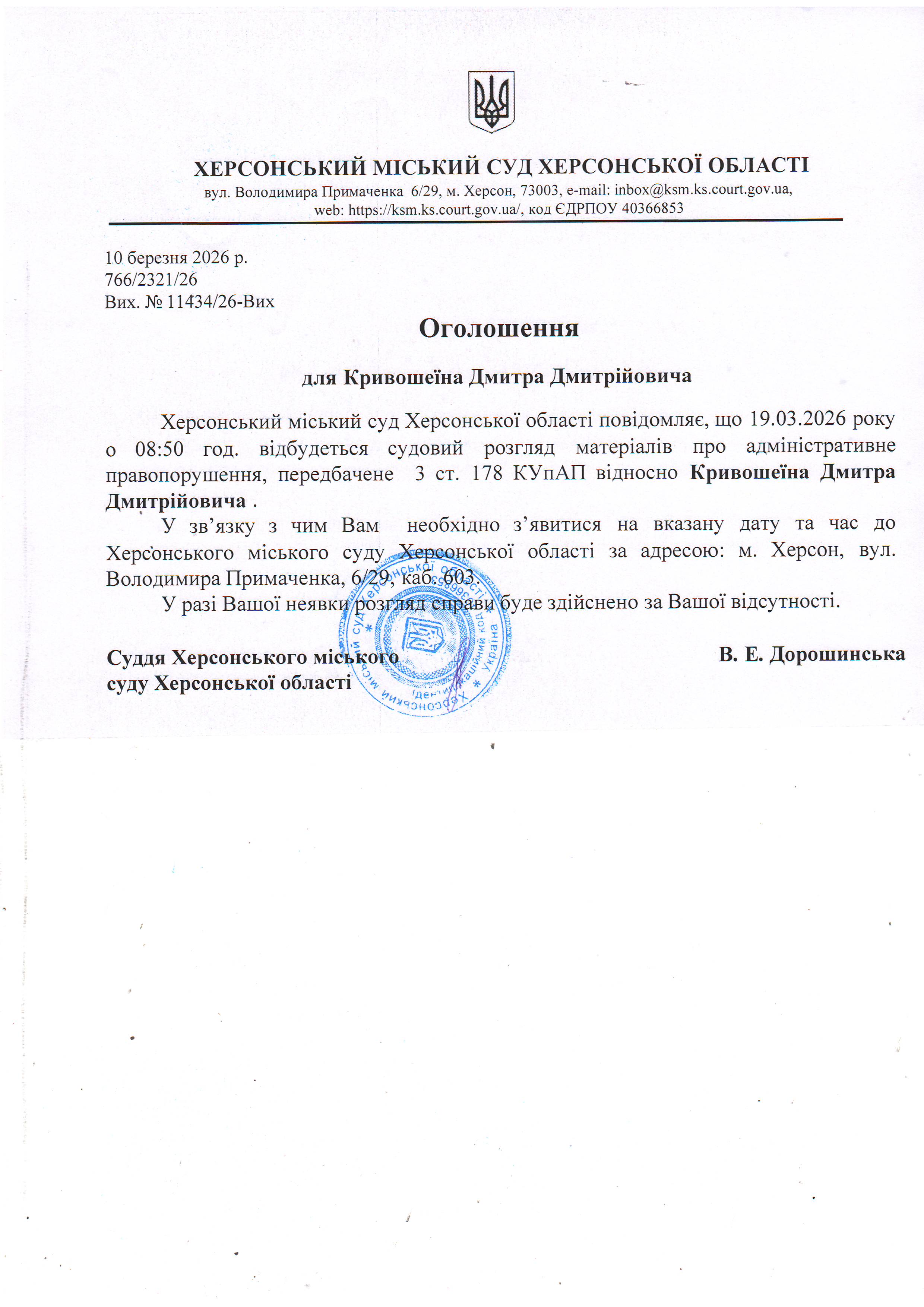 ОГОЛОШЕННЯ ПРО ВИКЛИК ДО СУДУ