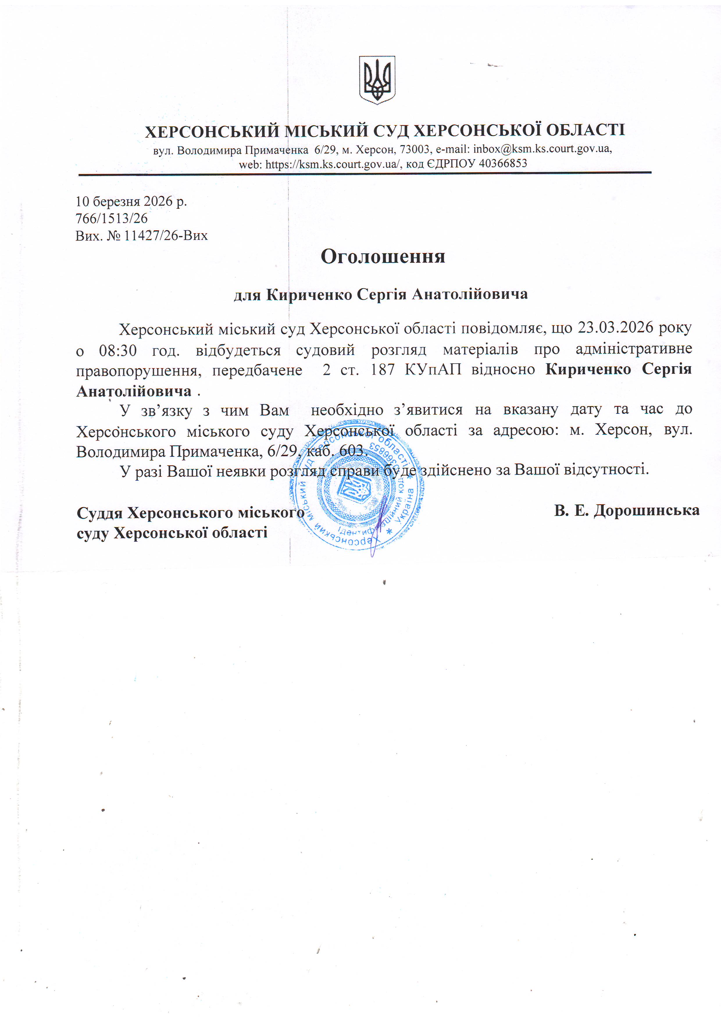 ОГОЛОШЕННЯ ПРО ВИКЛИК ДО СУДУ