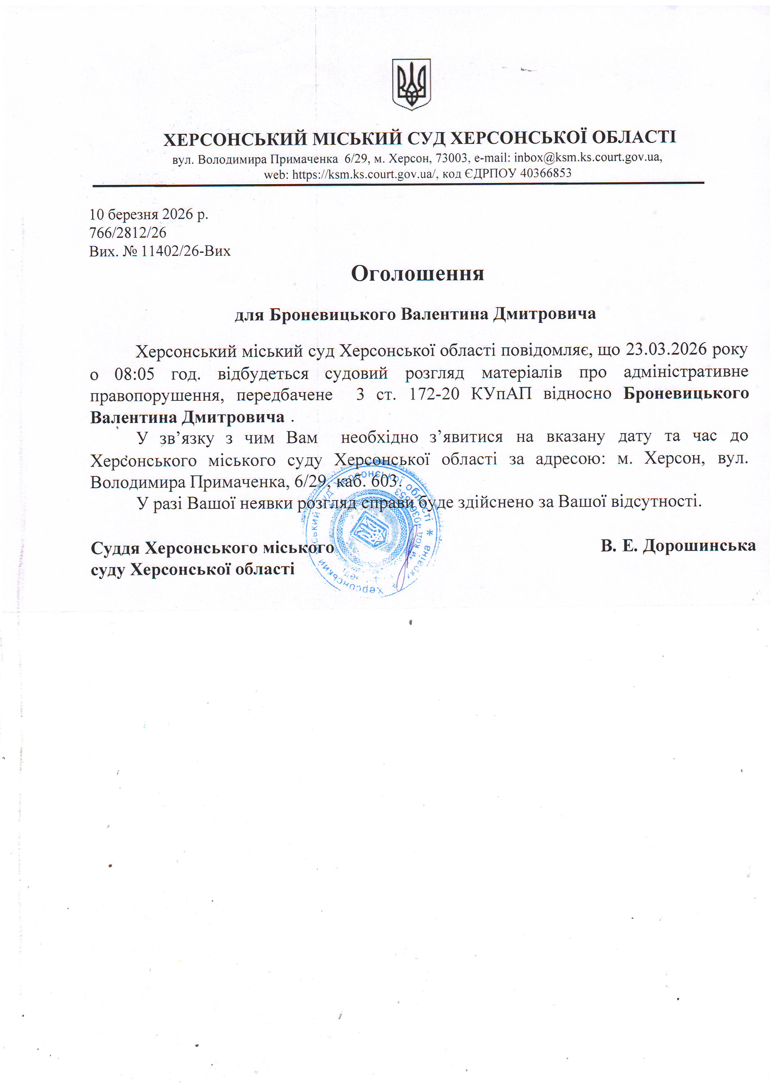 ОГОЛОШЕННЯ ПРО ВИКЛИК ДО СУДУ