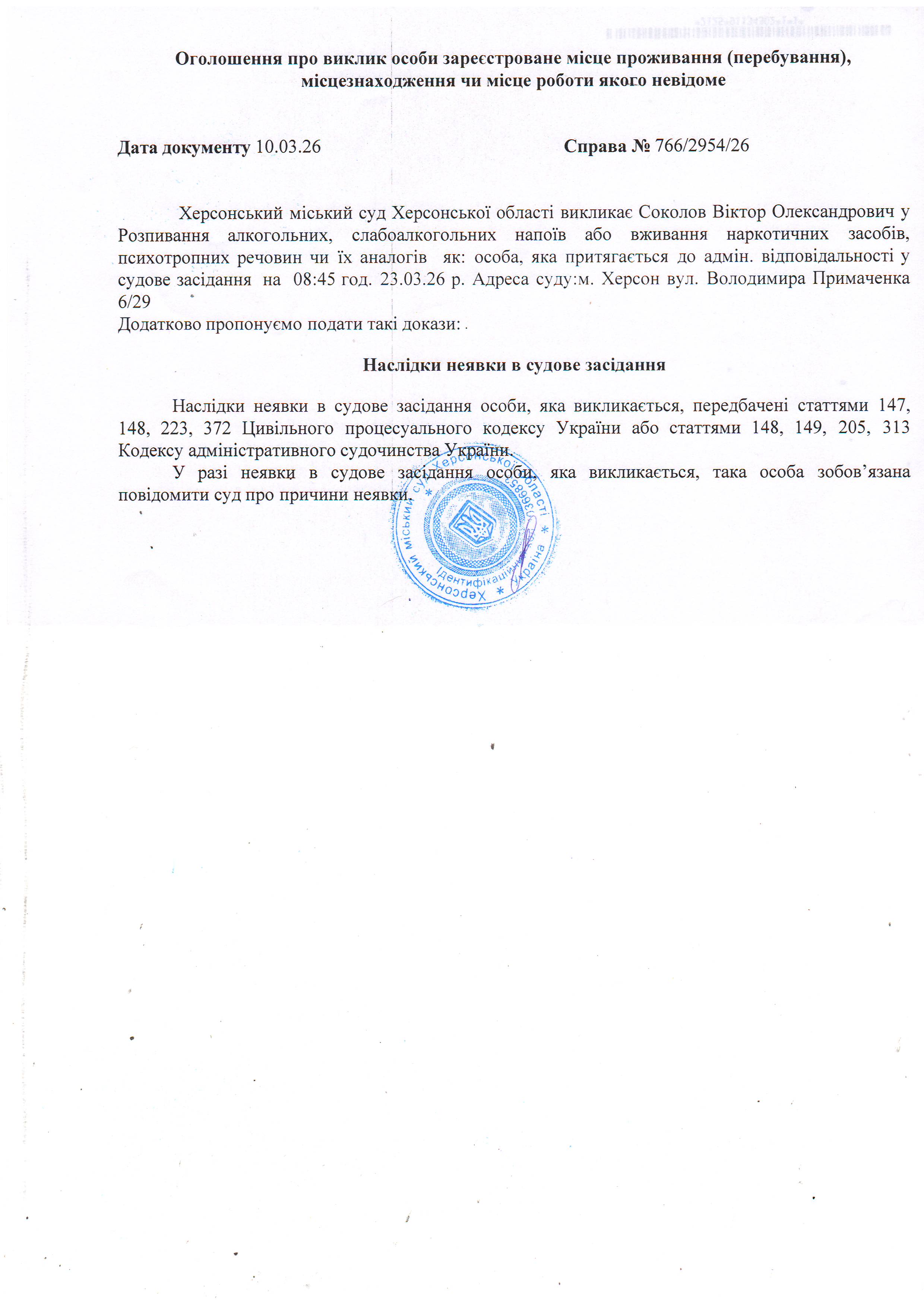 ОГОЛОШЕННЯ ПРО ВИКЛИК ДО СУДУ