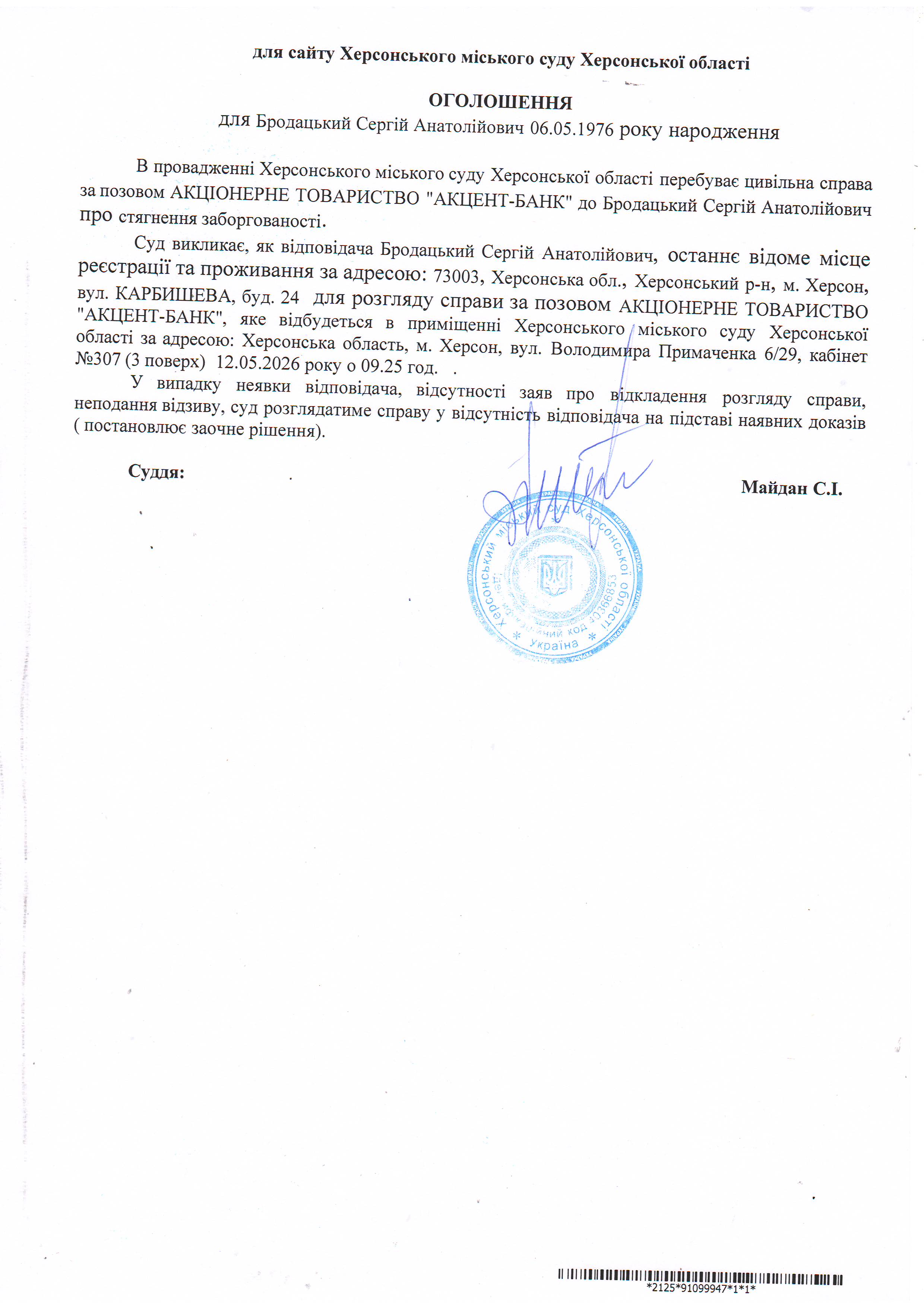 Оголошення для Бродацького Сергія Анатолійовича