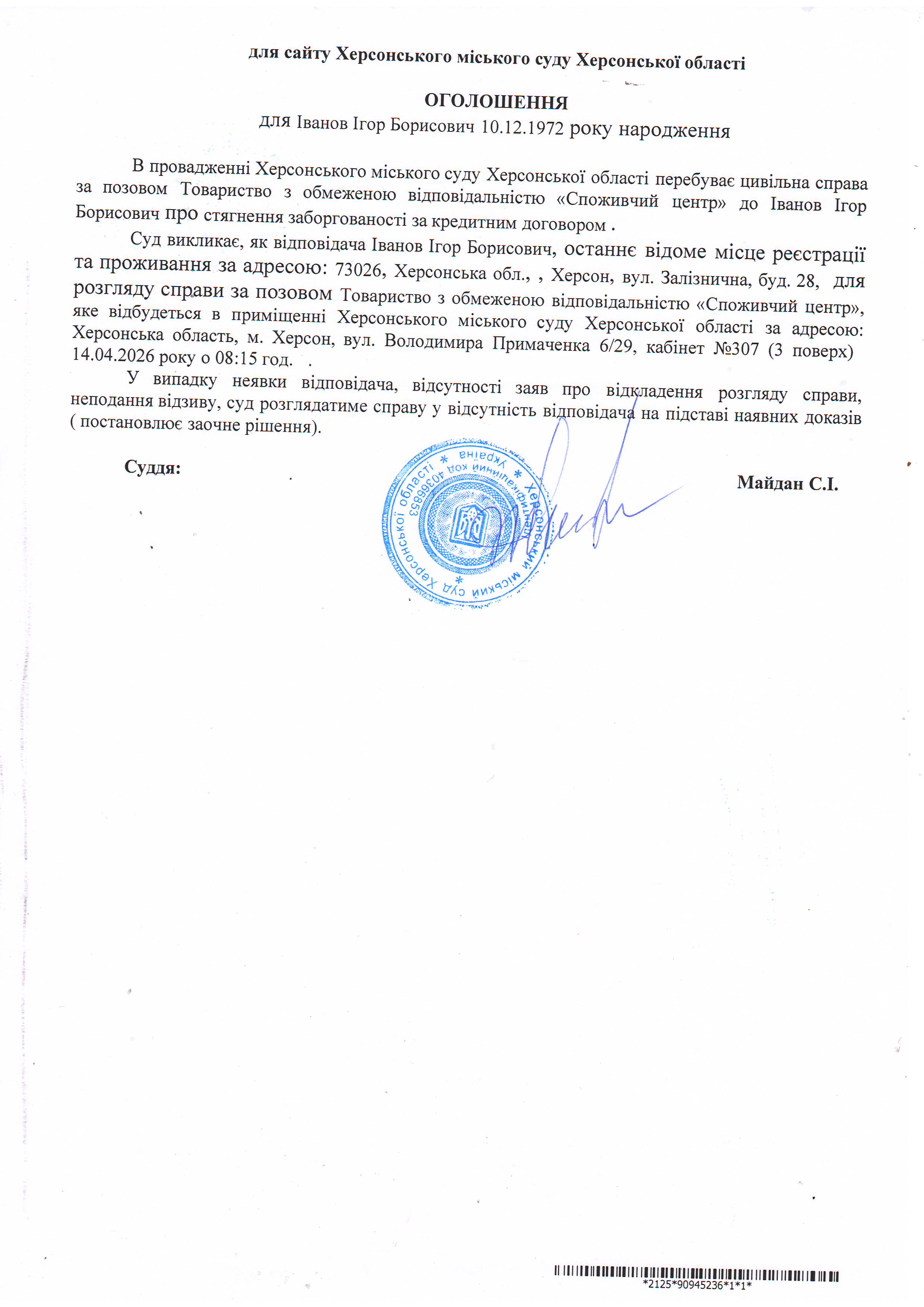 ОГОЛОШЕННЯ ПРО ВИКЛИК ДО СУДУ