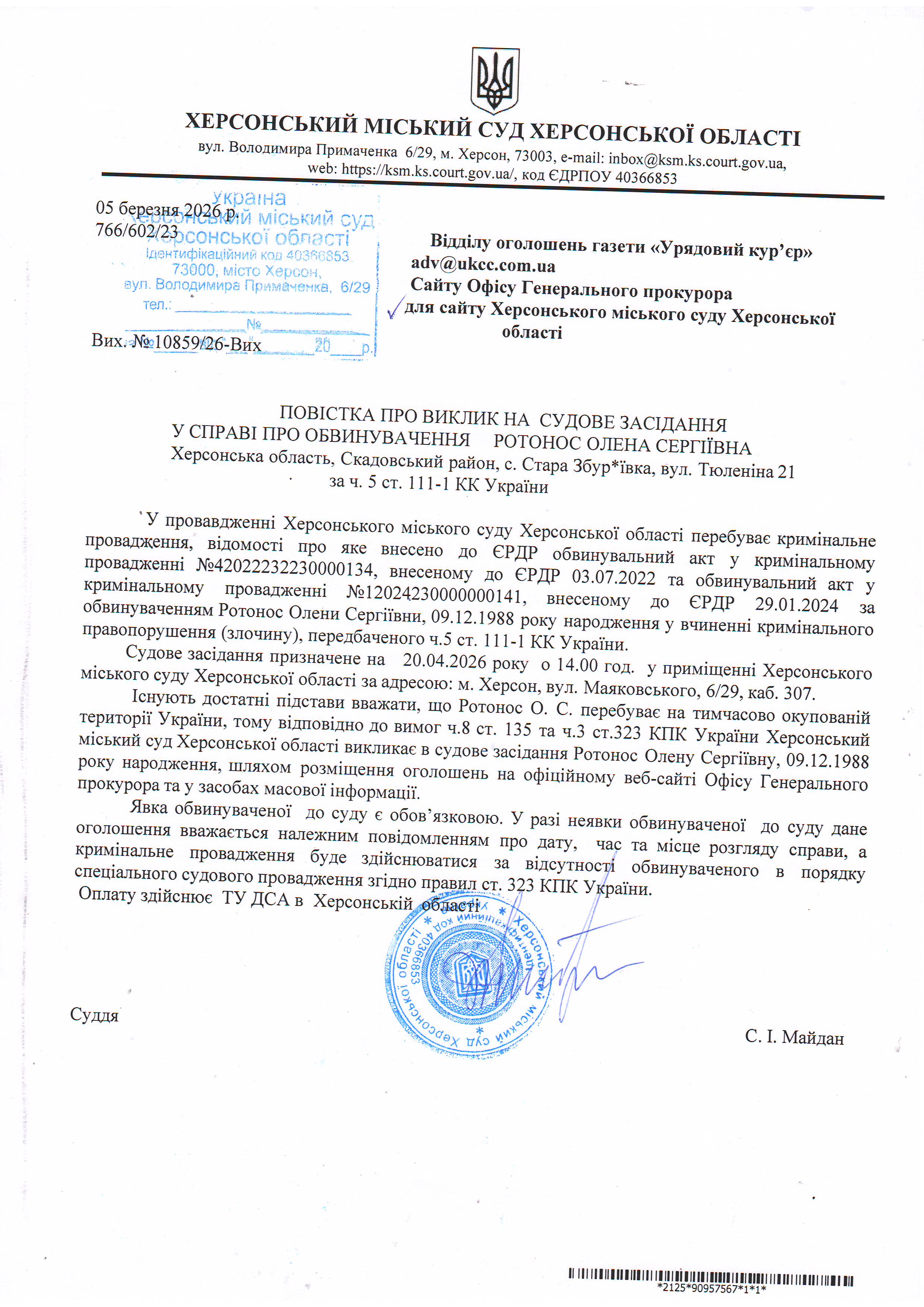 ОГОЛОШЕННЯ ПРО ВИКЛИК ДО СУДУ