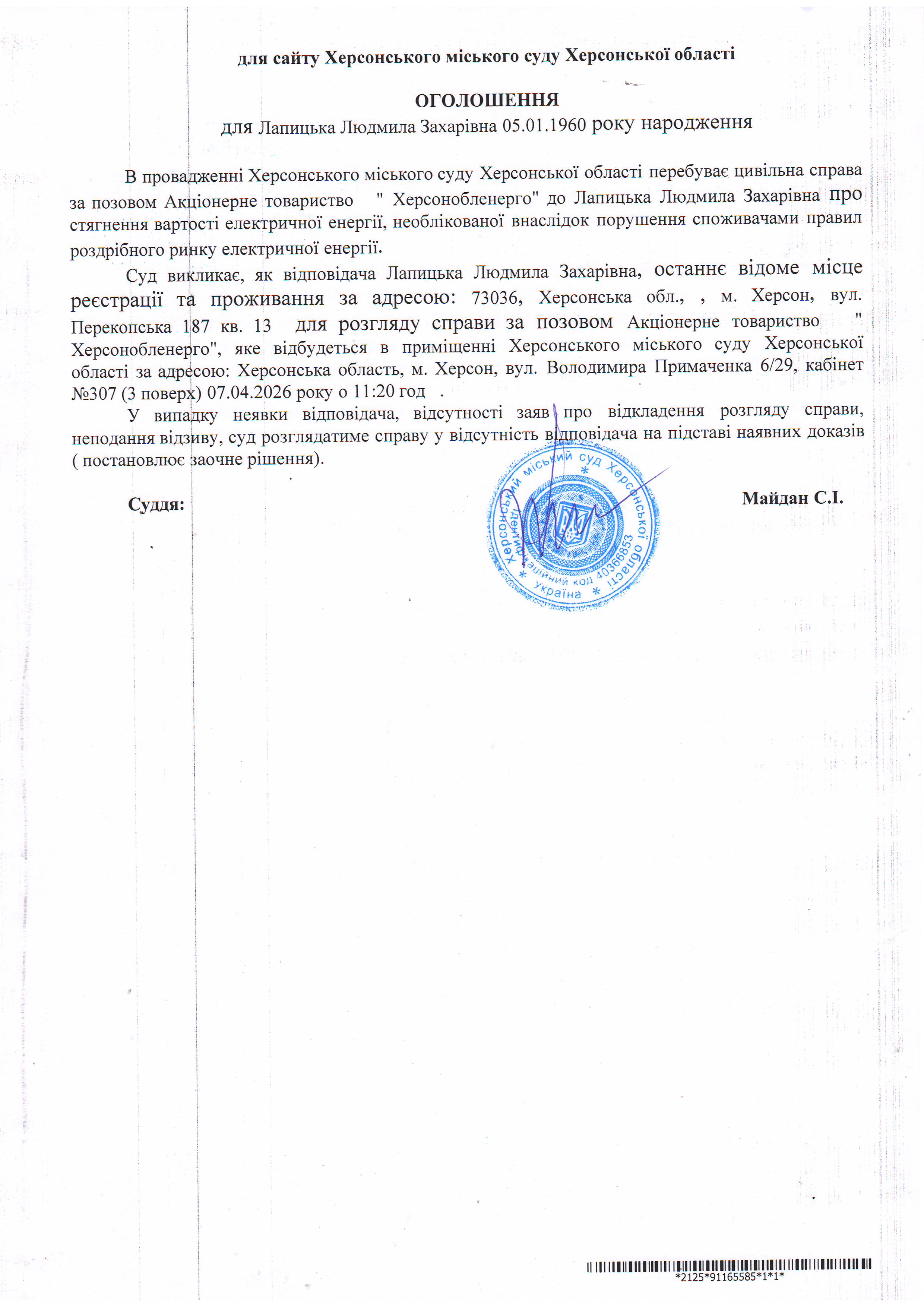 ОГОЛОШЕННЯ ПРО ВИКЛИК ДО СУДУ