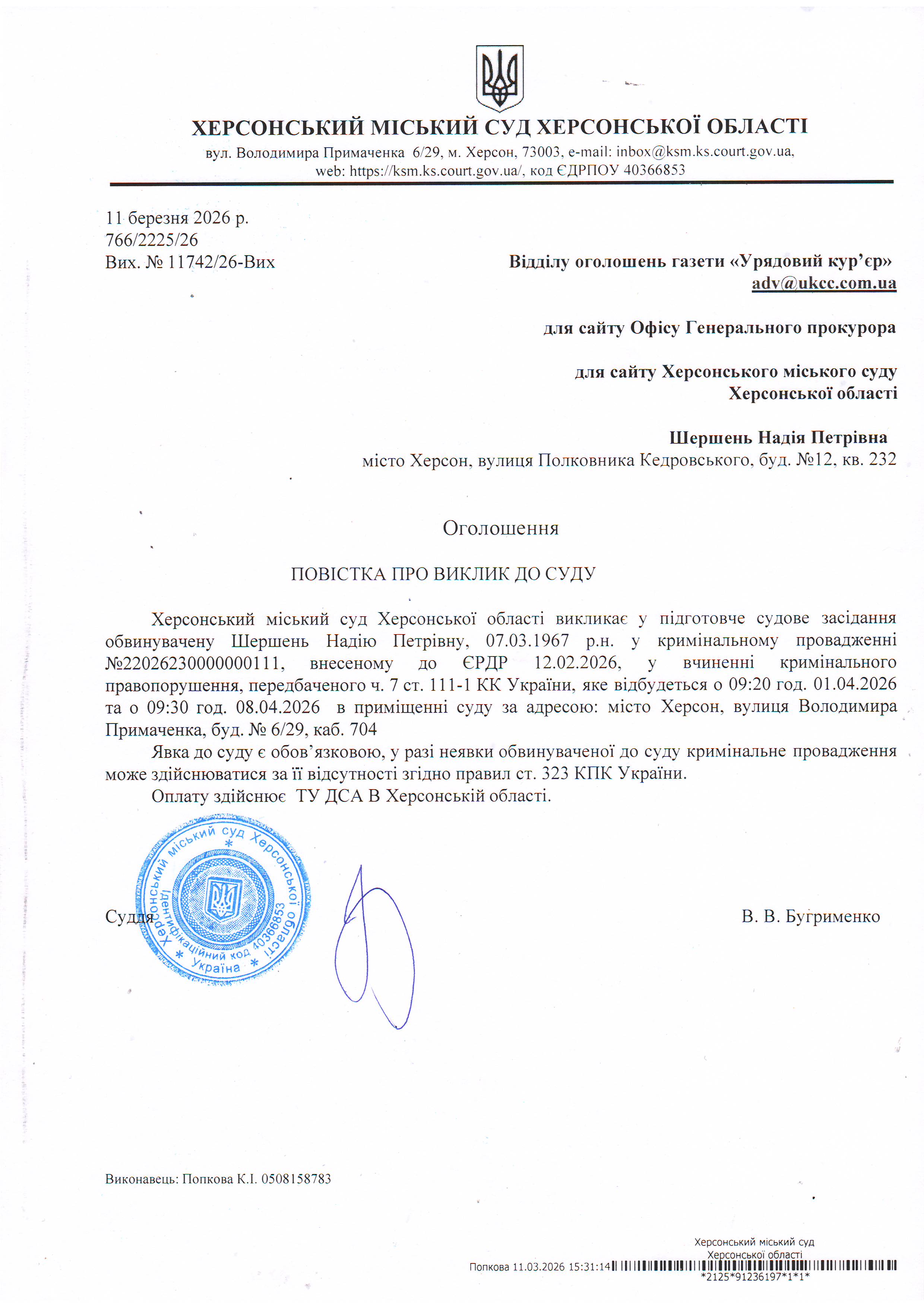 ОГОЛОШЕННЯ ПРО ВИКЛИК ДО СУДУ