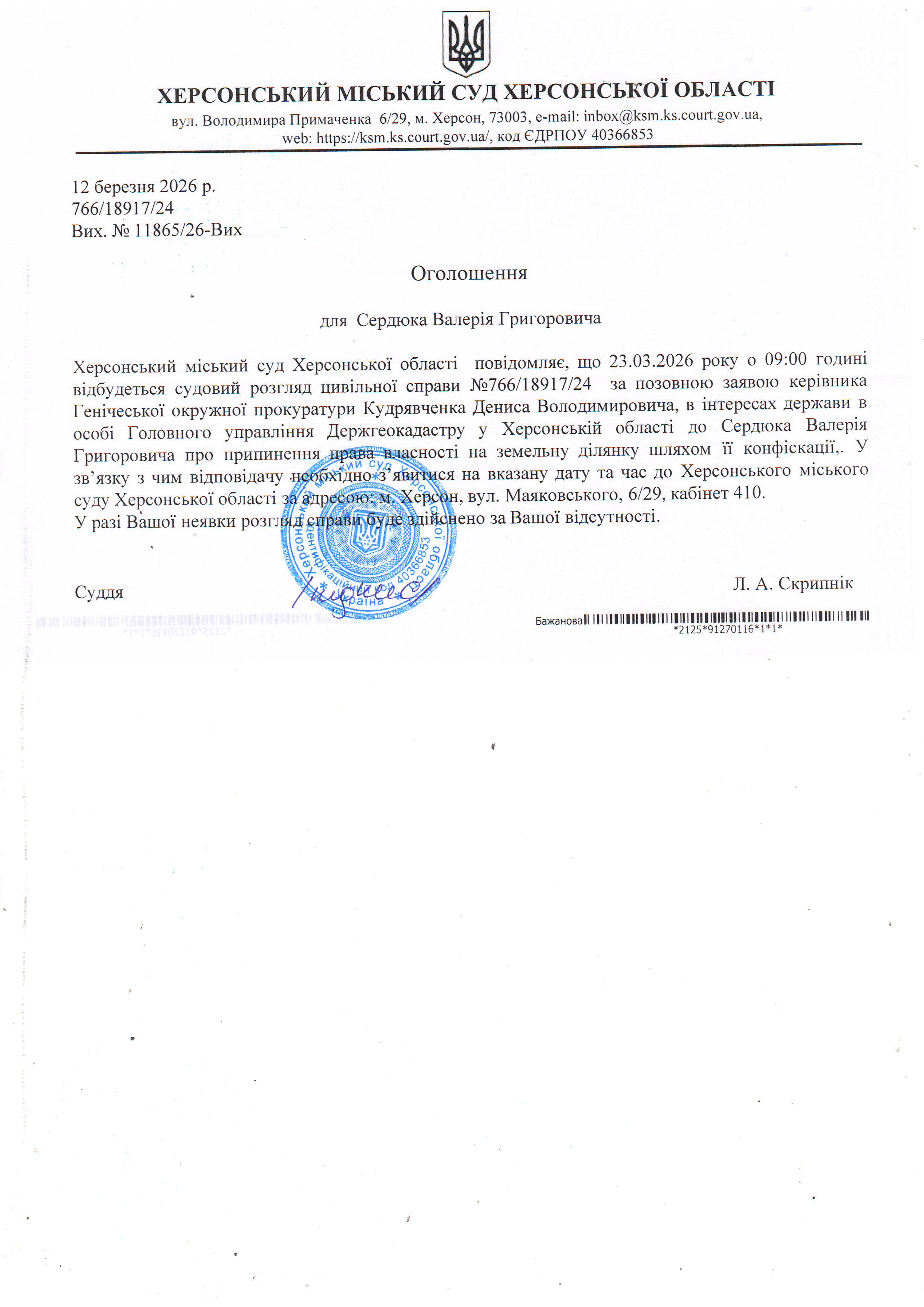 Оголошення для Сердюка Валерія Григоровича