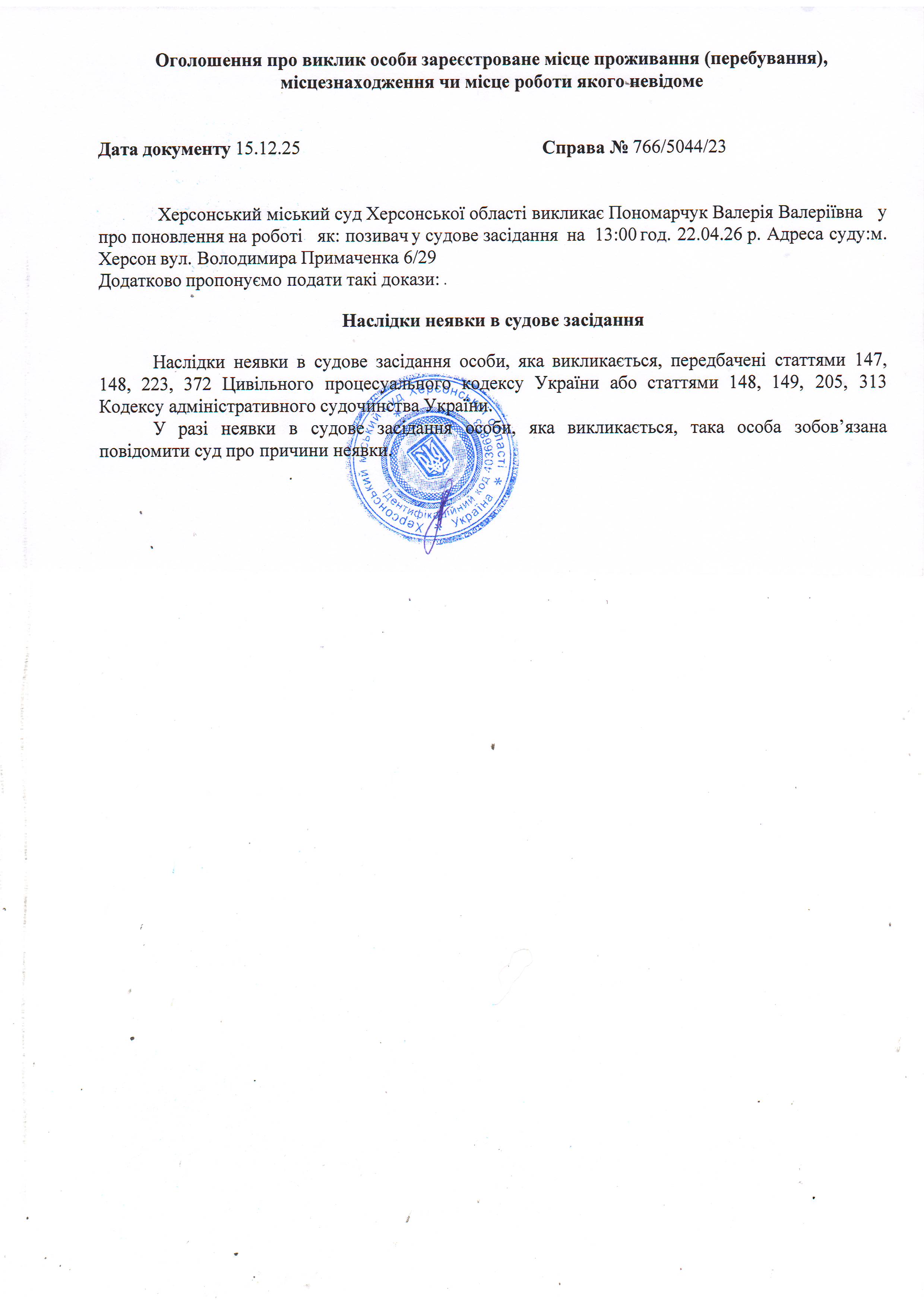 ОГОЛОШЕННЯ ПРО ВИКЛИК ДО СУДУ