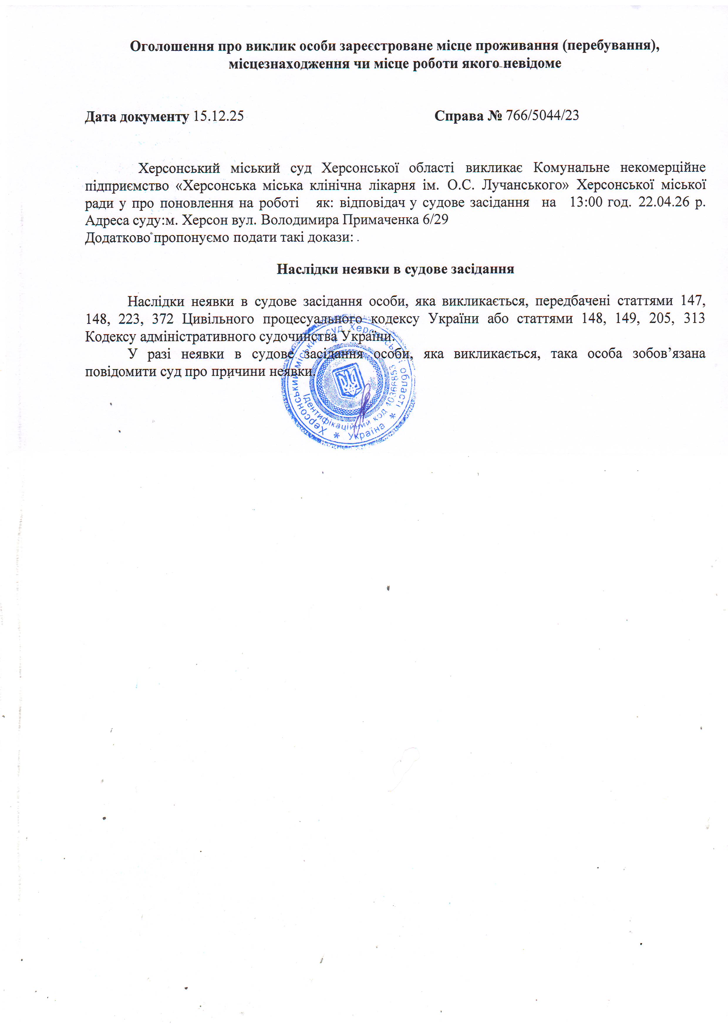 ОГОЛОШЕННЯ ПРО ВИКЛИК ДО СУДУ