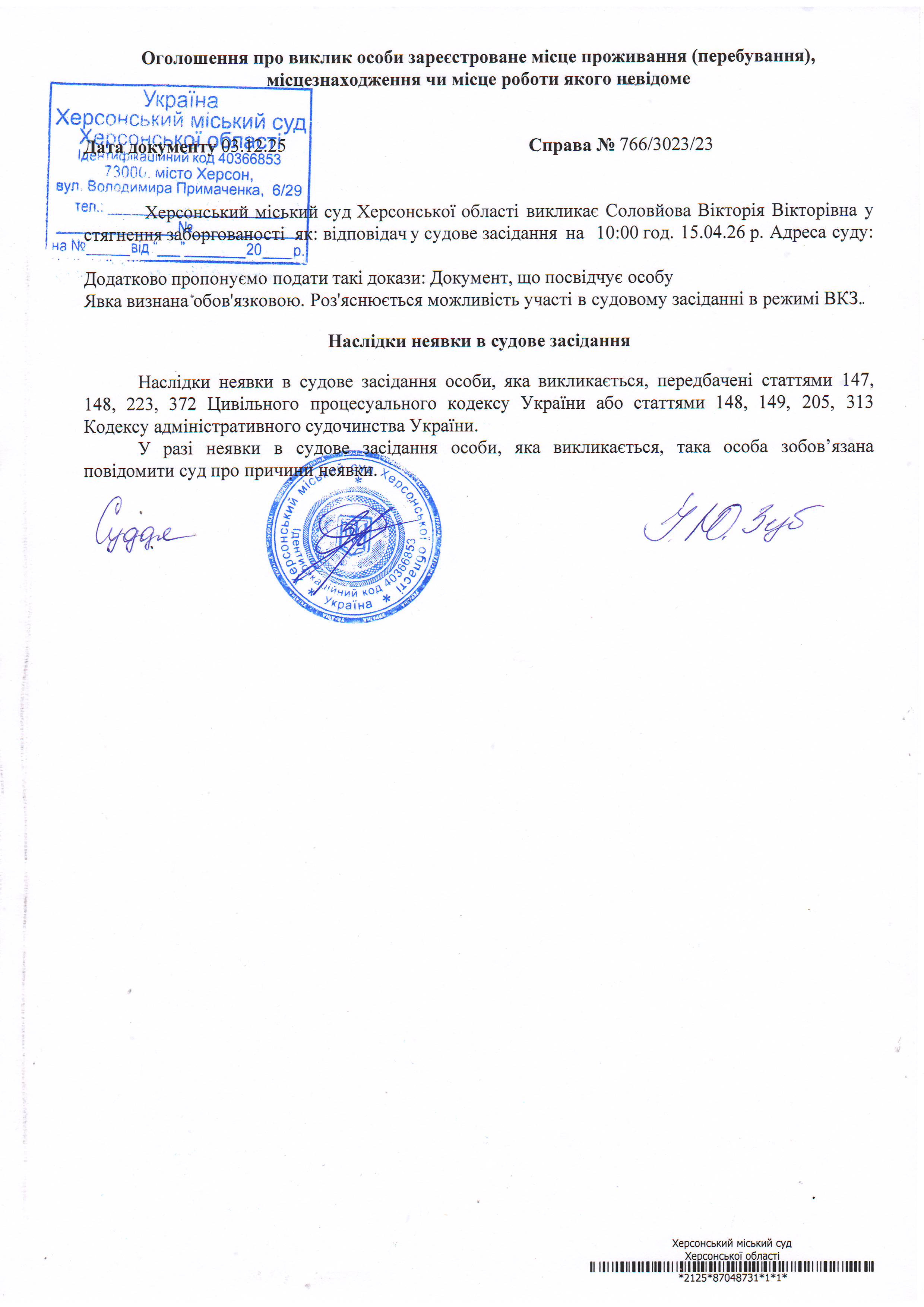 ОГОЛОШЕННЯ ПРО ВИКЛИК ДО СУДУ