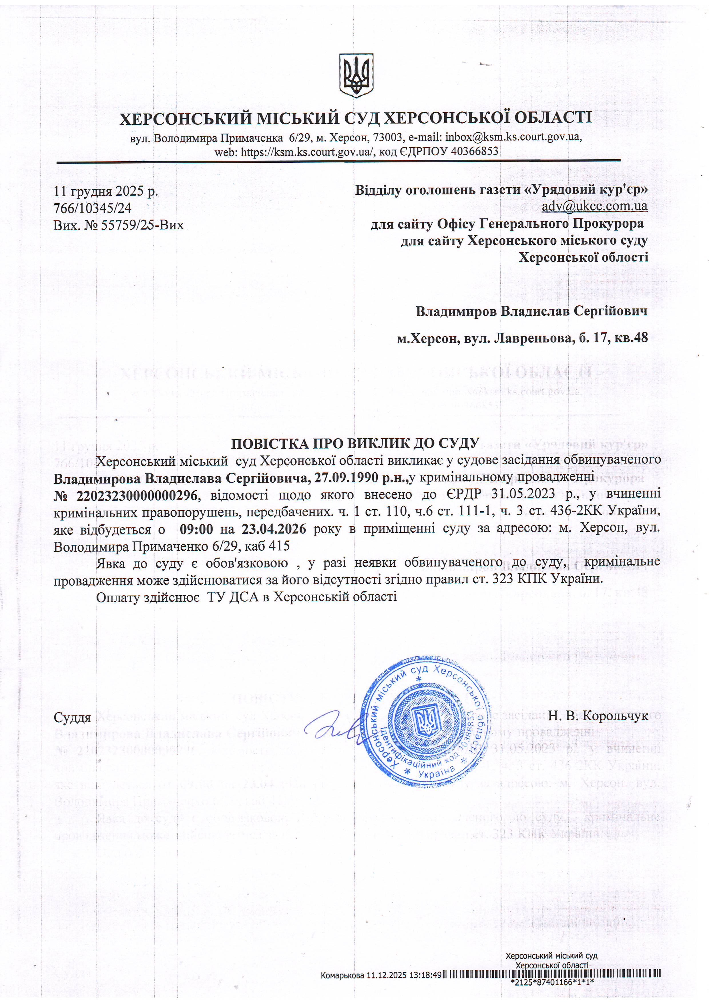ОГОЛОШЕННЯ ПРО ВИКЛИК ДО СУДУ