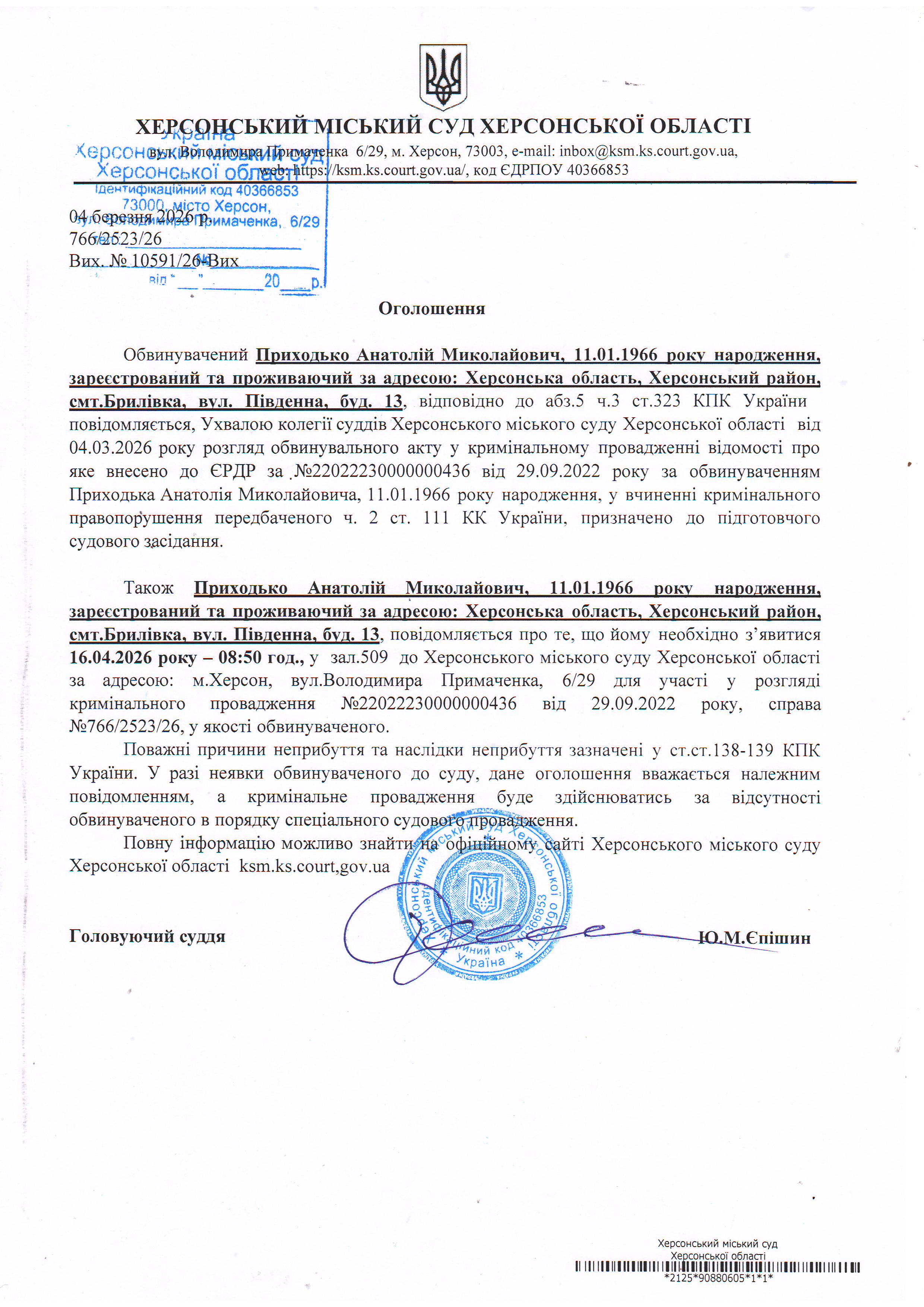 ОГОЛОШЕННЯ ПРО ВИКЛИК ДО СУДУ