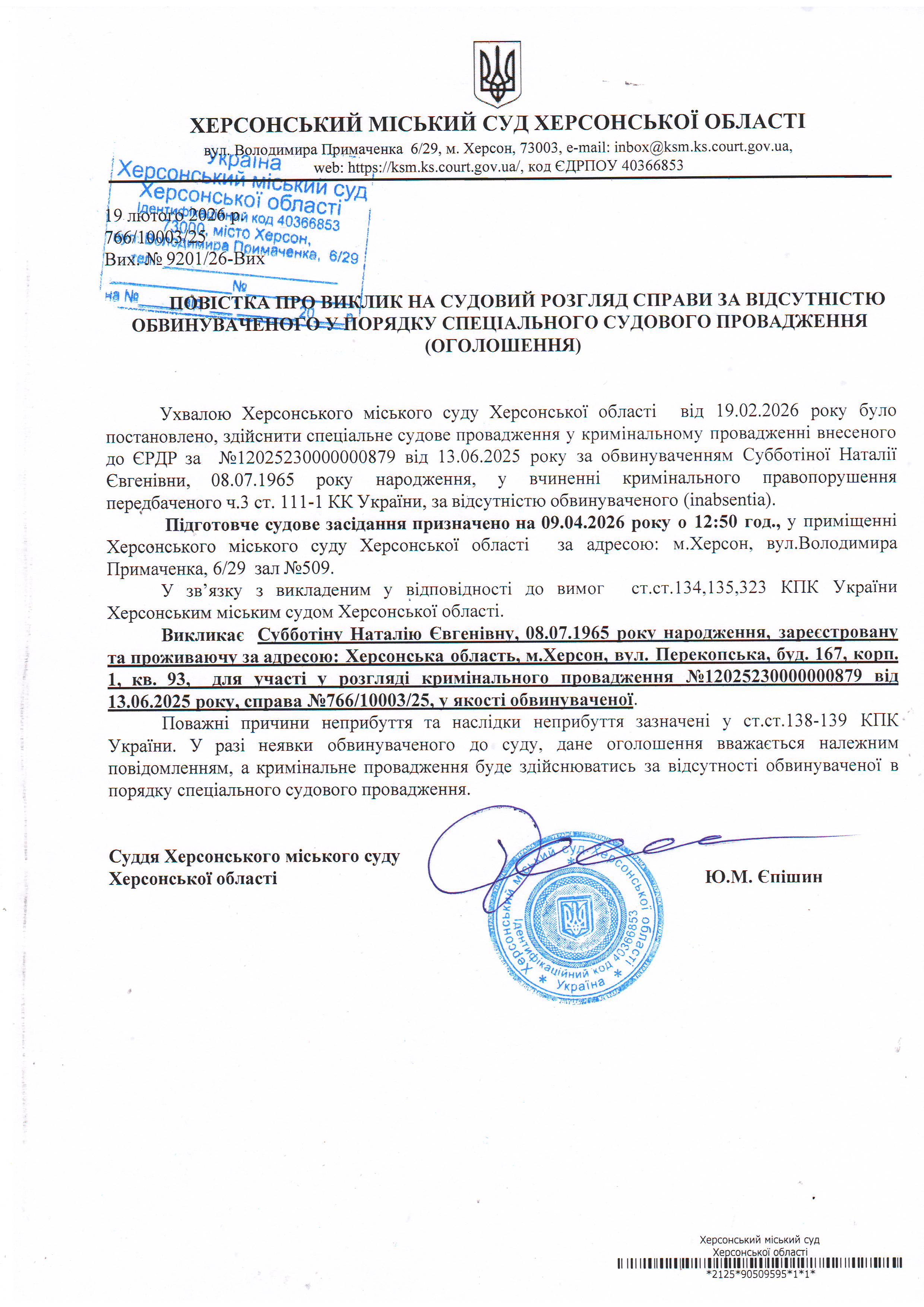 ОГОЛОШЕННЯ ПРО ВИКЛИК ДО СУДУ