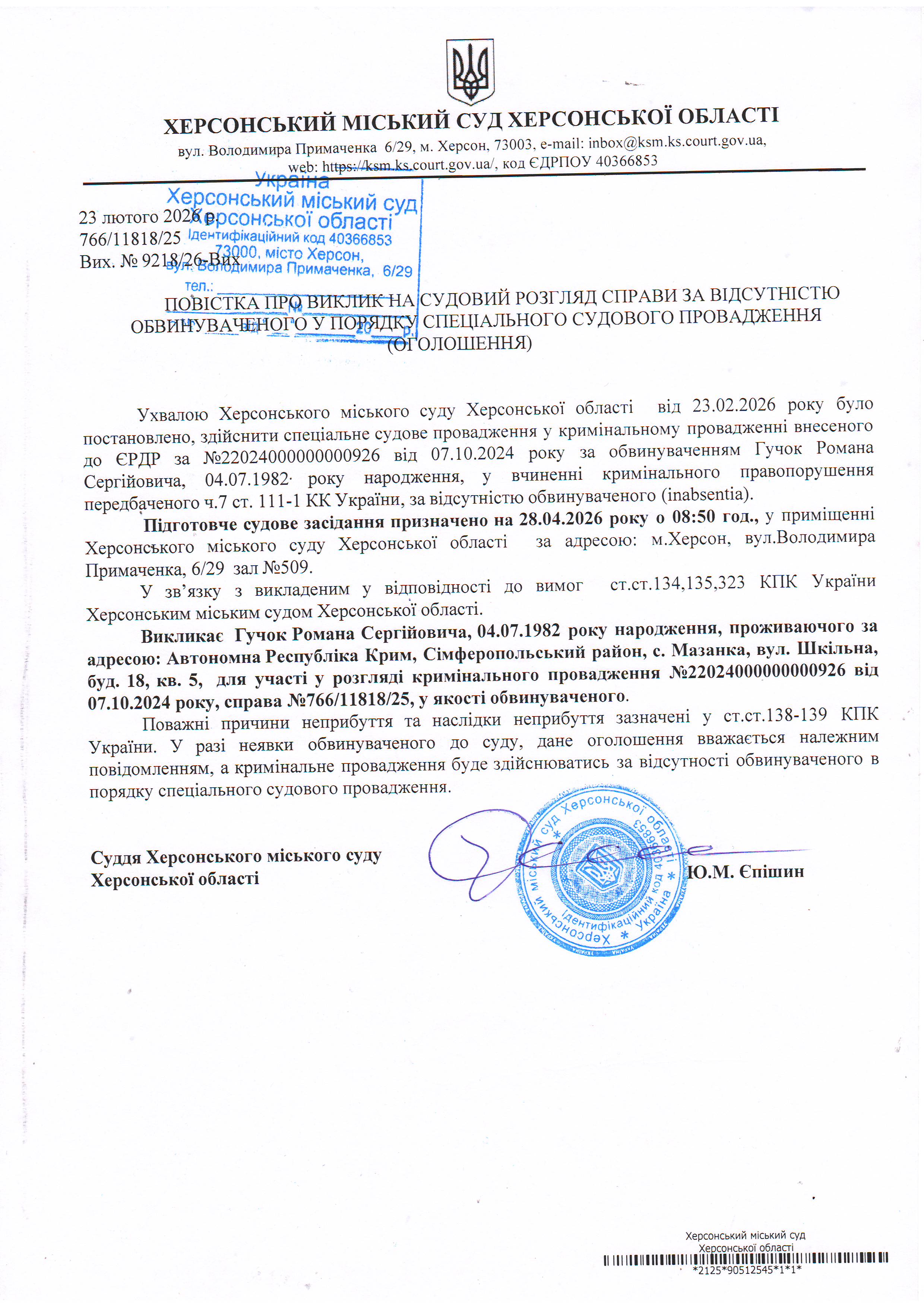 ОГОЛОШЕННЯ ПРО ВИКЛИК ДО СУДУ