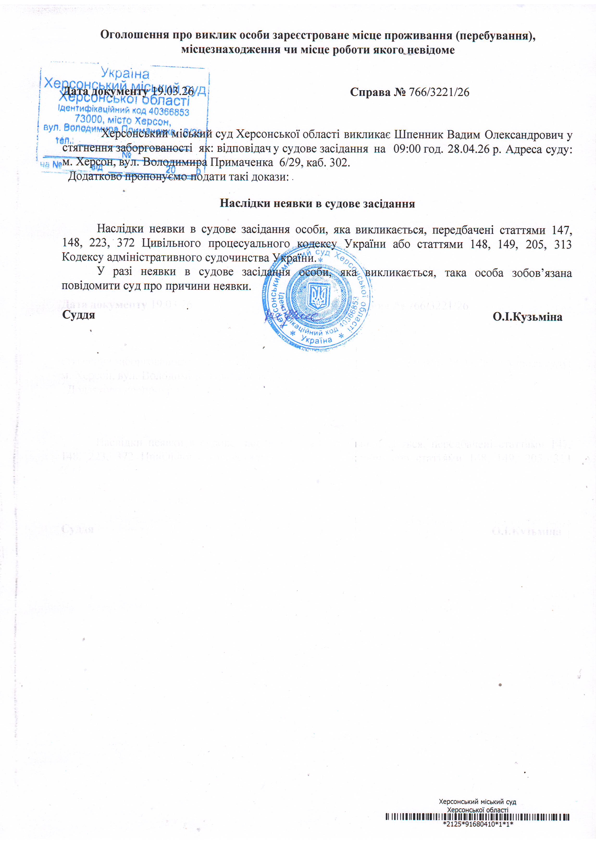 ОГОЛОШЕННЯ ПРО ВИКЛИК ДО СУДУ