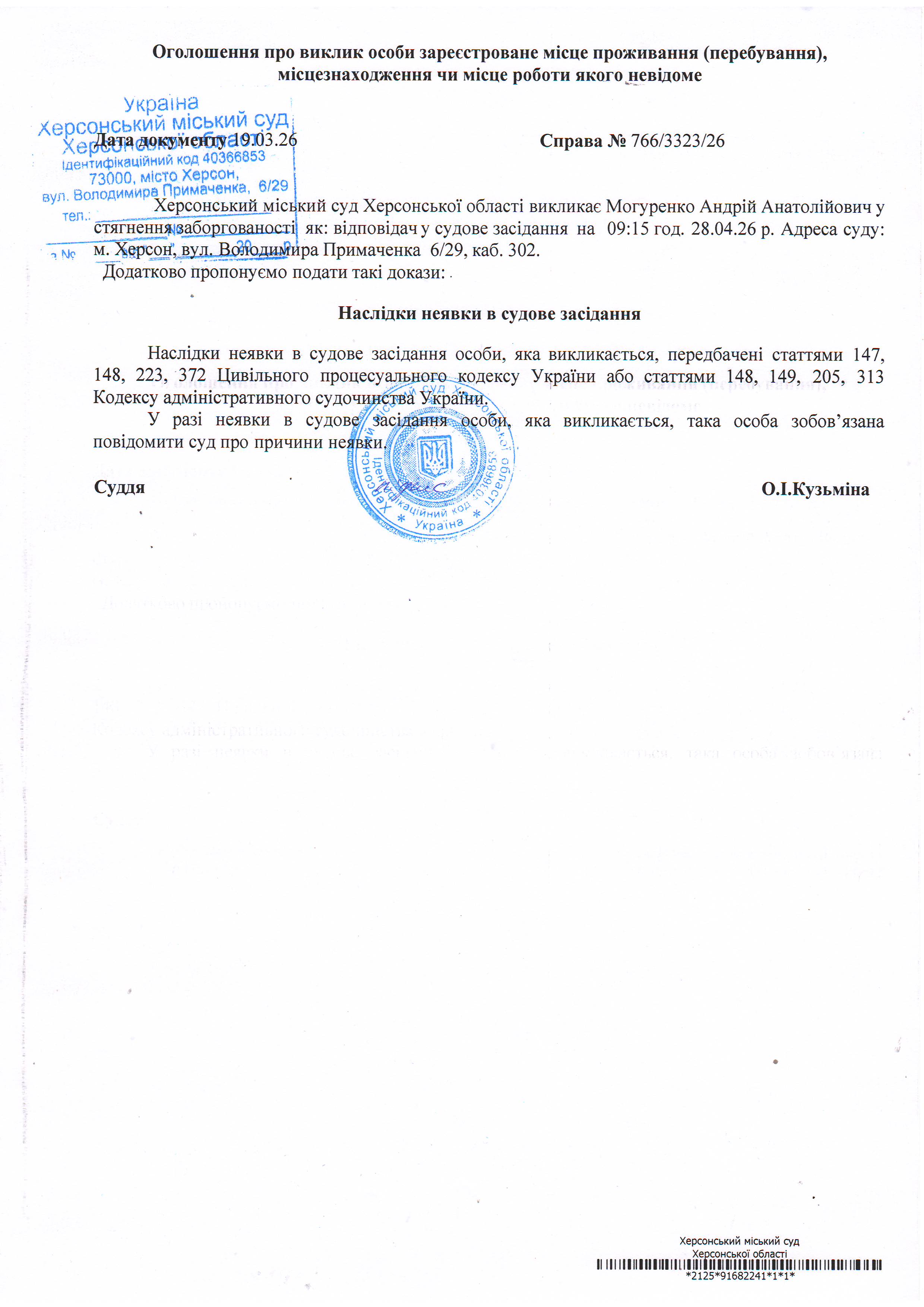 ОГОЛОШЕННЯ ПРО ВИКЛИК ДО СУДУ