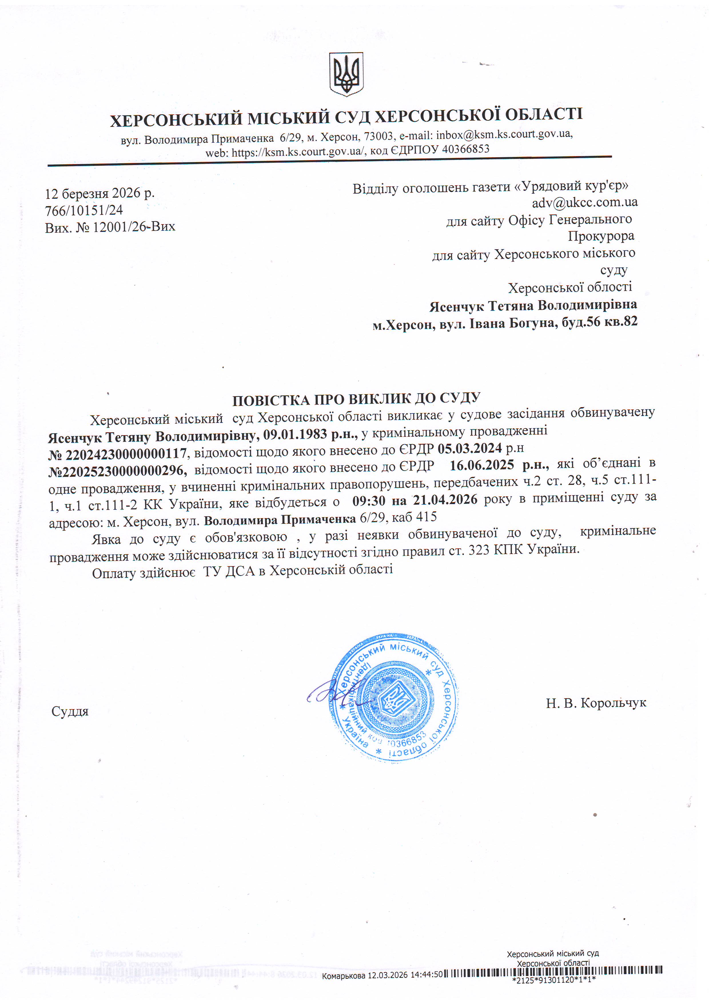 ОГОЛОШЕННЯ ПРО ВИКЛИК ДО СУДУ