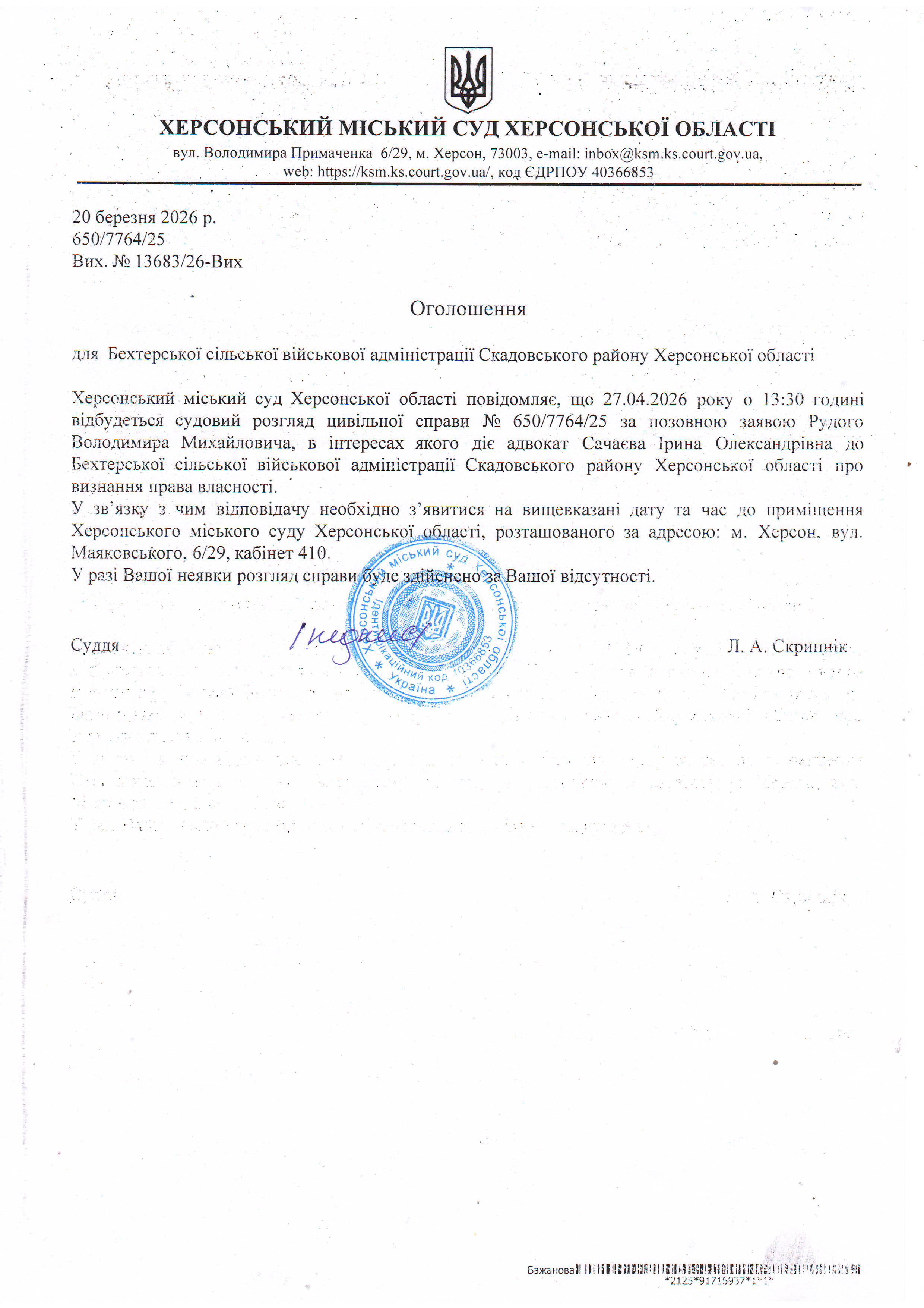 Оголошення для Бехтерської сільської військової адміністрації Скадовського району Херсонської області