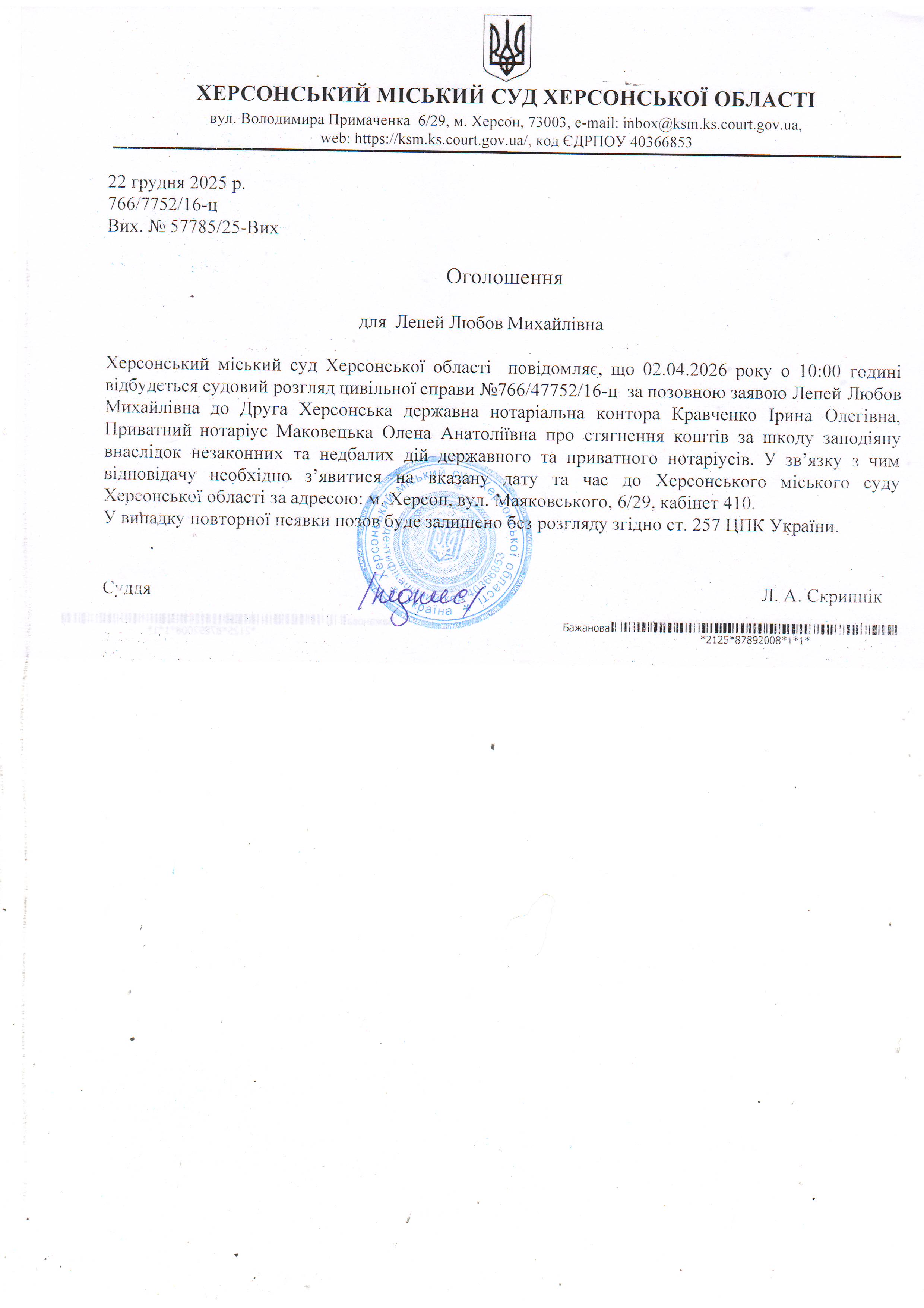 Оголошення про виклик особи в суд та повідомлення про судове рішення