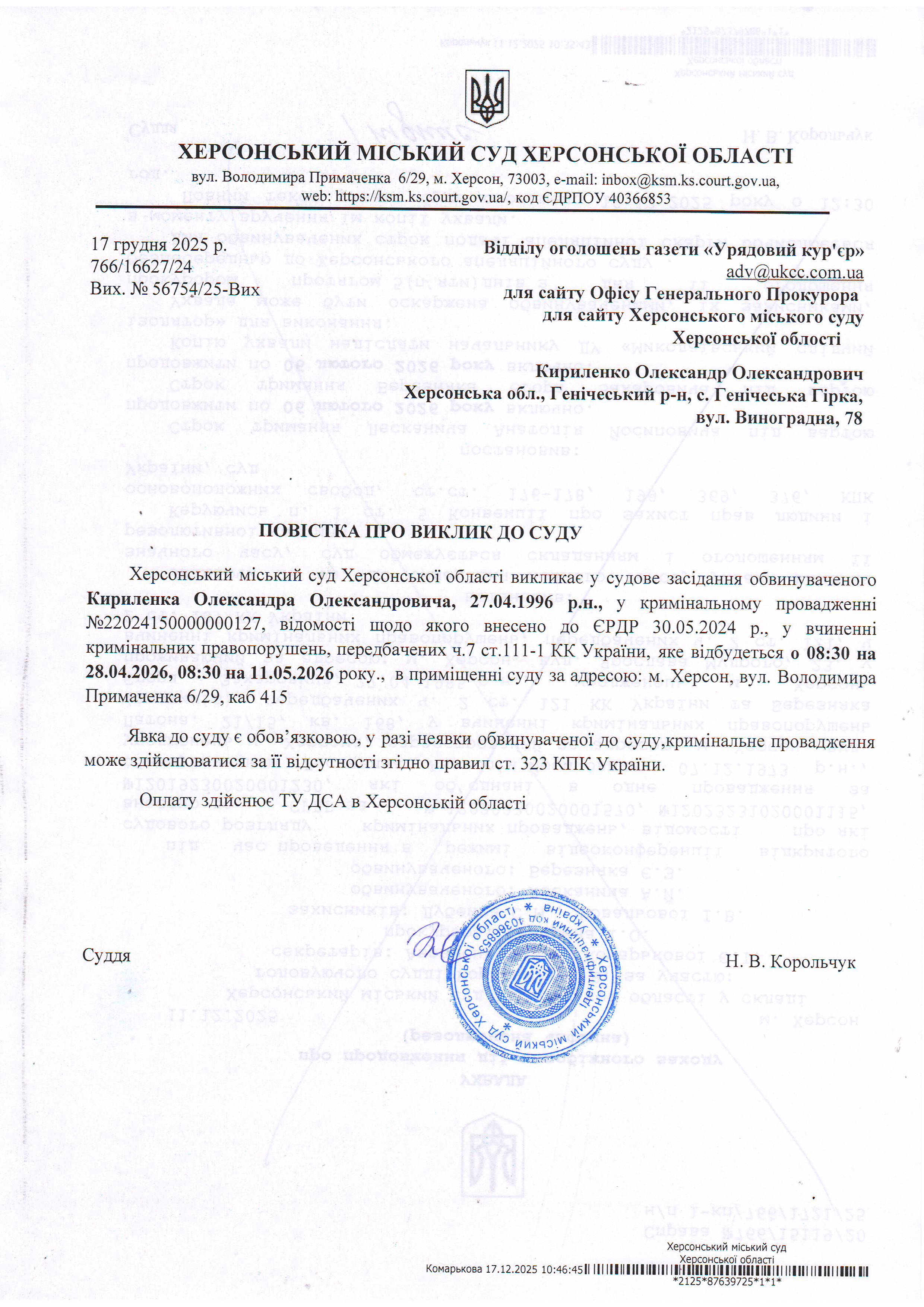 ОГОЛОШЕННЯ ПРО ВИКЛИК ДО СУДУ