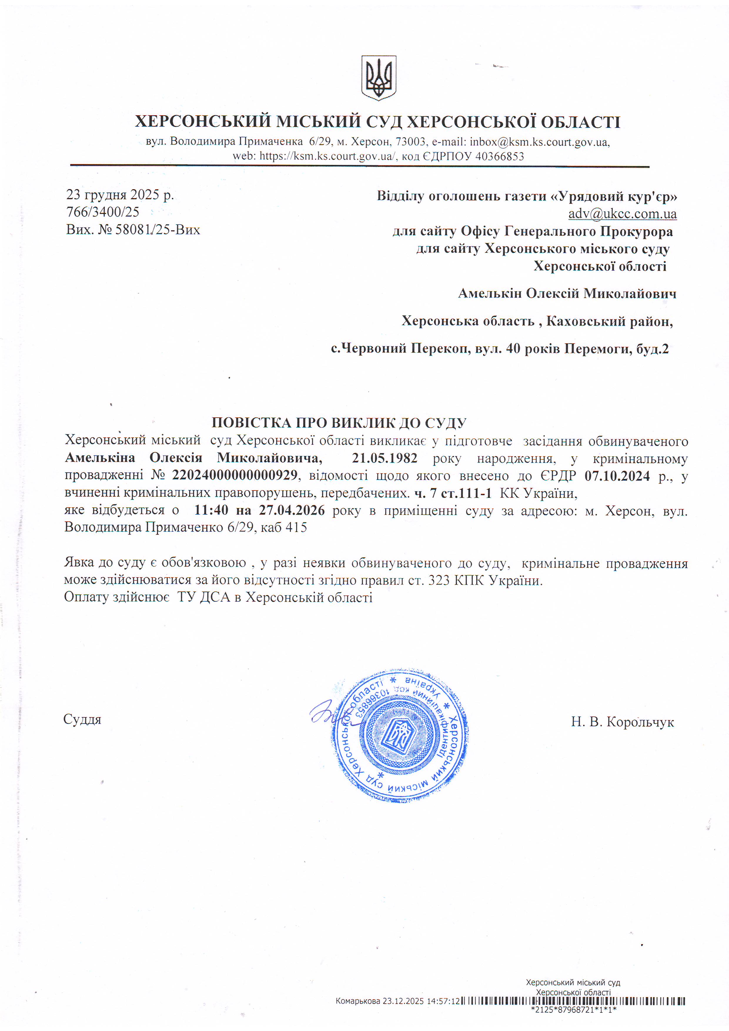 ОГОЛОШЕННЯ ПРО ВИКЛИК ДО СУДУ