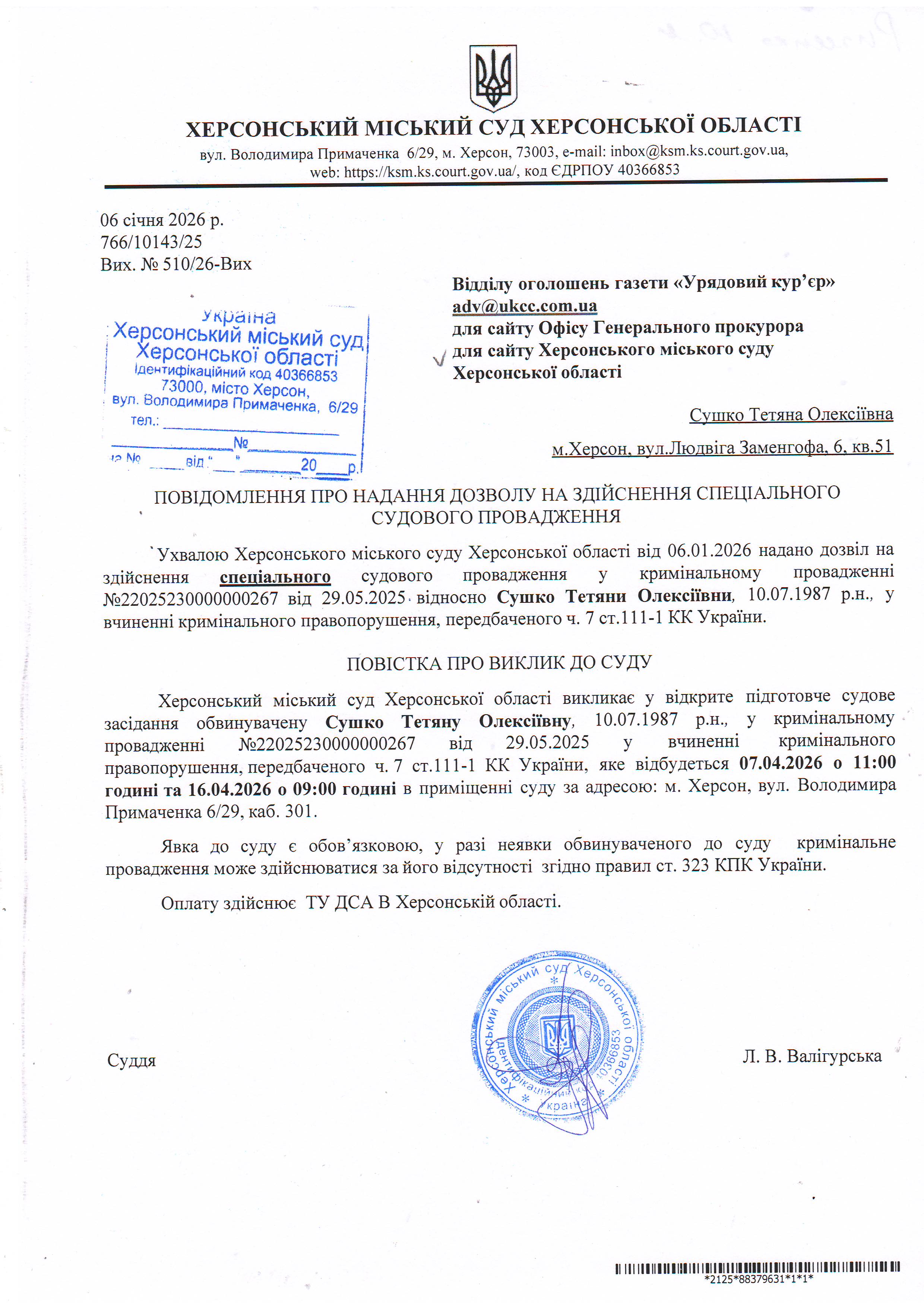 Оголошення про виклик особи в суд та повідомлення про судове рішення
