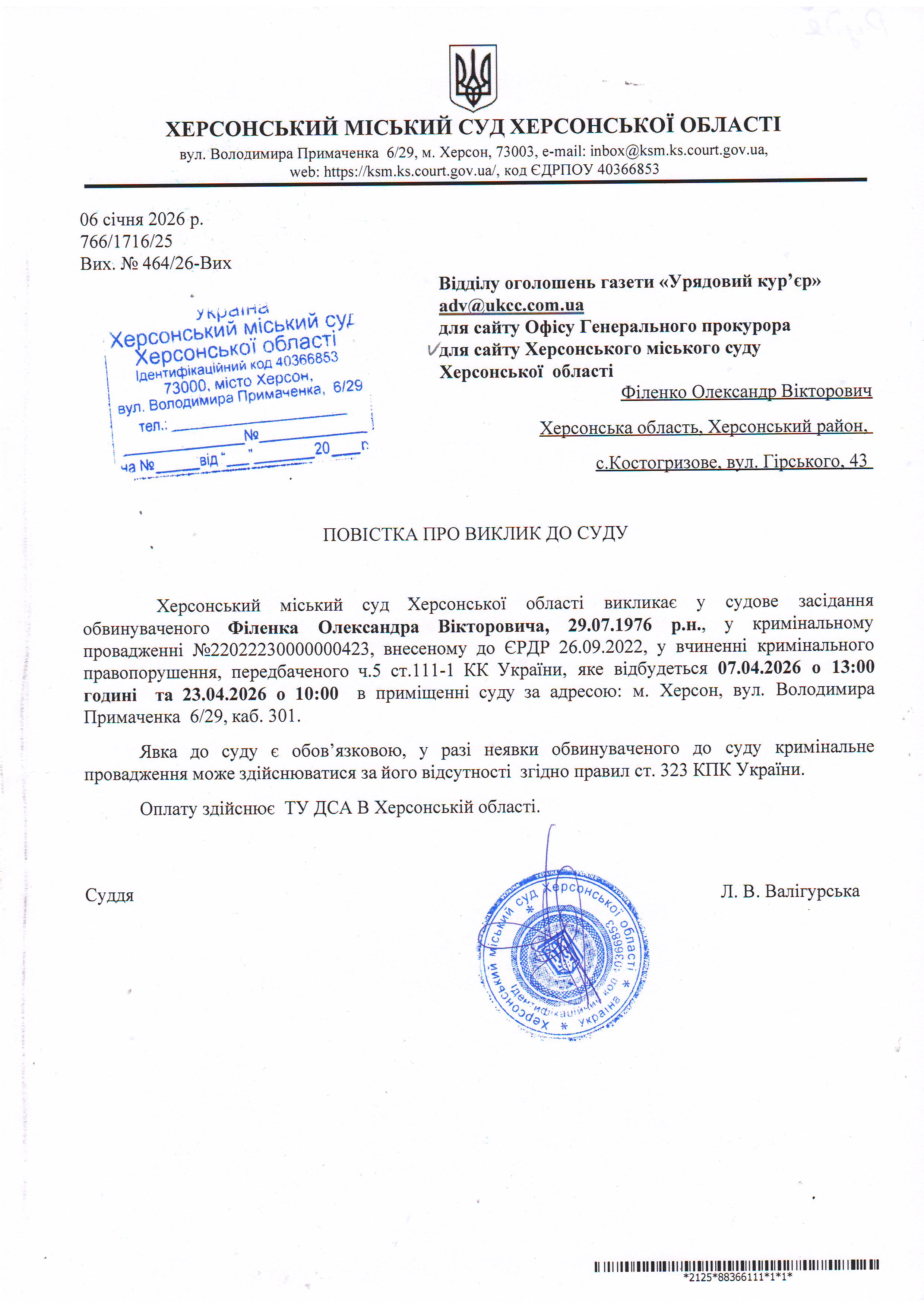 ОГОЛОШЕННЯ ПРО ВИКЛИК ДО СУДУ